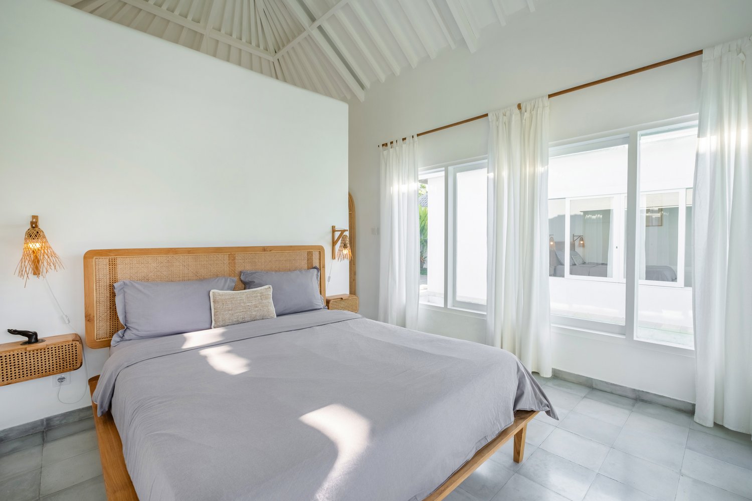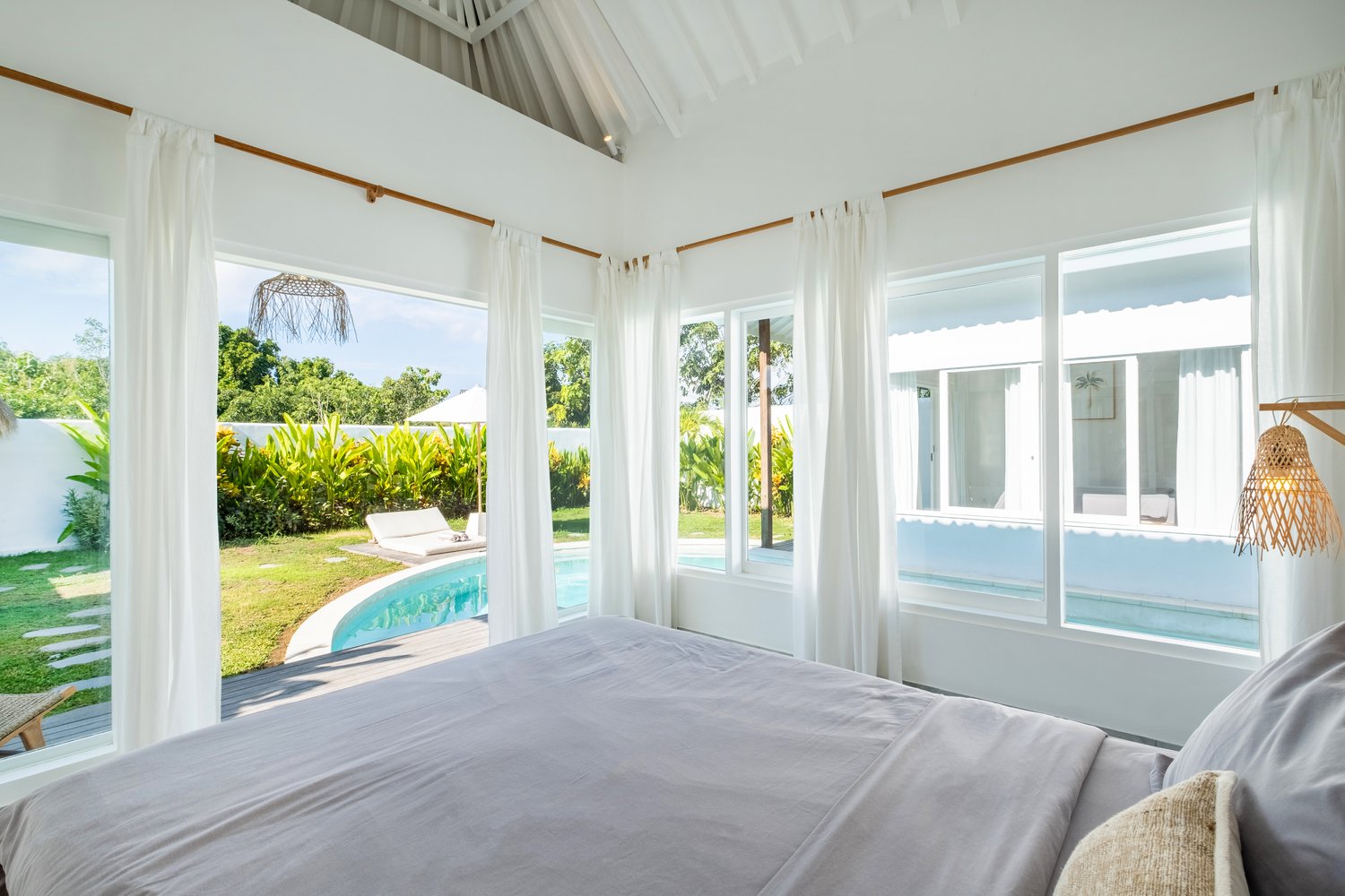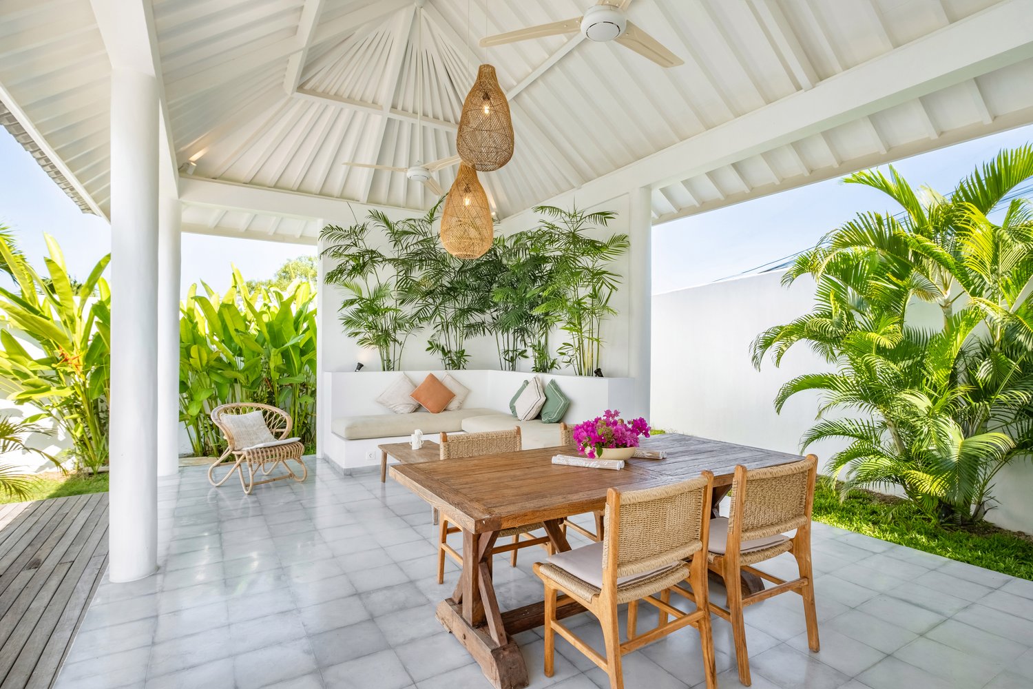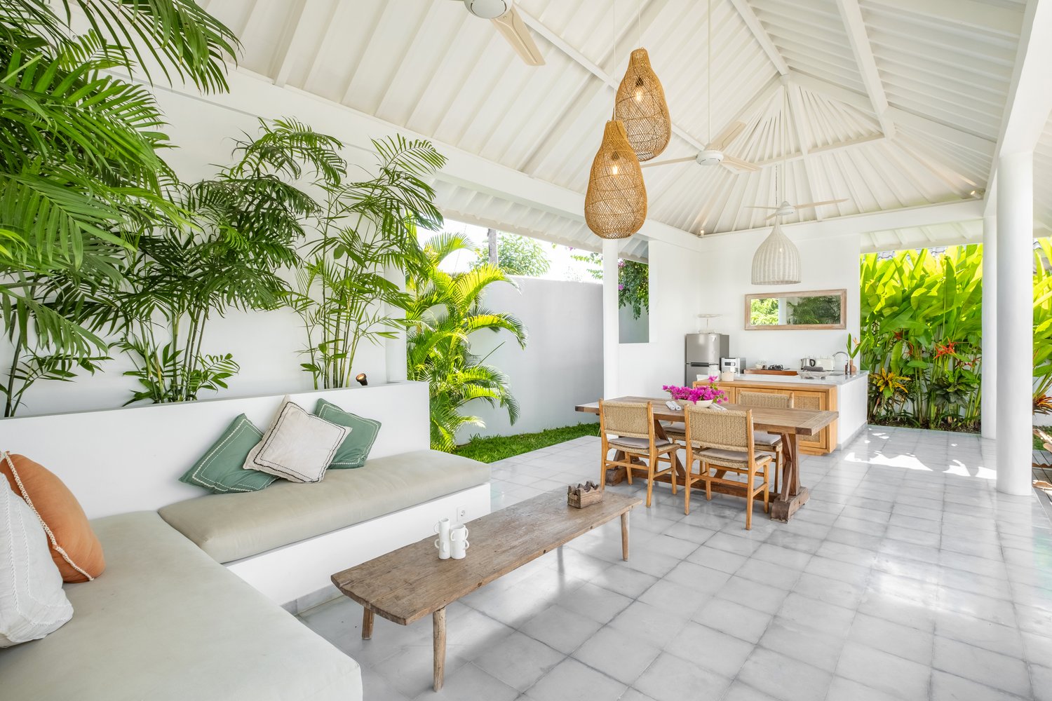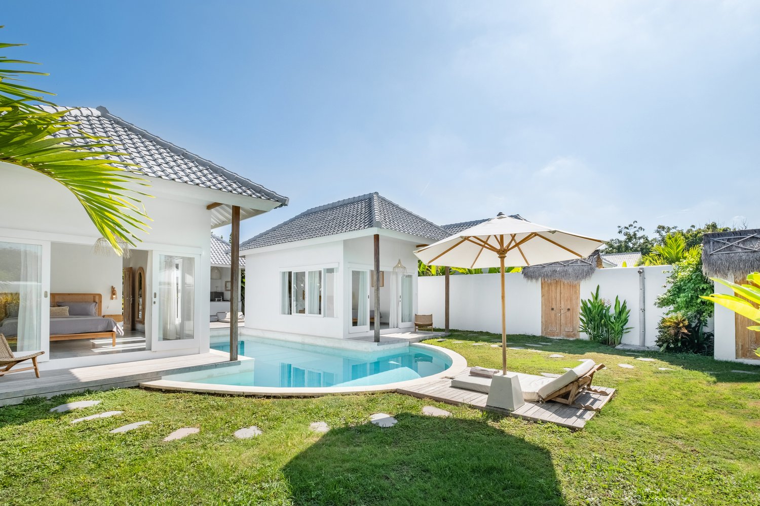 Enjoy your own private pool, surrounded by lush greenery, perfect for relaxing and soaking up the island vibes. Inside, the villa features a beautifully designed living space that blends comfort and elegance. Two tastefully furnished bedrooms provide a restful haven, each designed to ensure a peaceful night’s sleep.