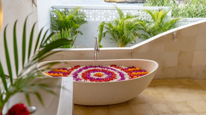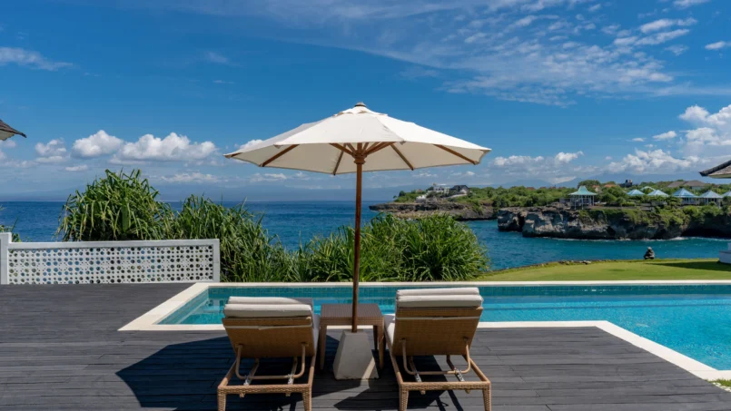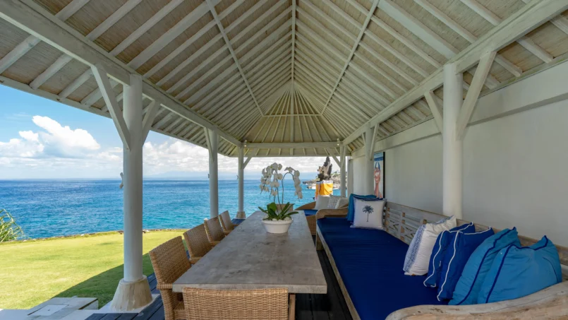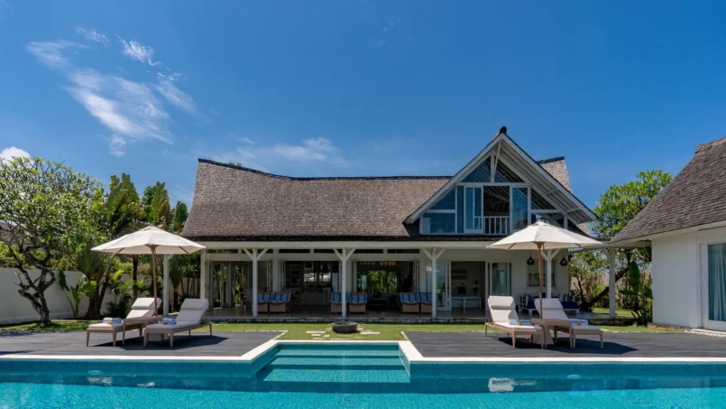 If you wish to dine indoors, then the eight-seater dining table is ready for your use and since it’s set against a gorgeous backdrop, you can even enjoy the view as you dig into your deliciously-prepared meals. There is a fully-equipped kitchen at the back of the living area found with all modern amenities and appliances. A lounge area can be found on the mezzanine floor, furnished with L-shaped comfy couches, ottoman, a flat-screen TV, and beautiful views of the ocean.