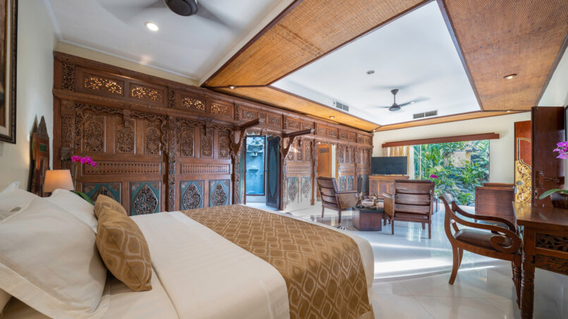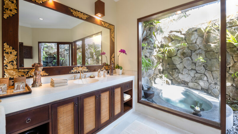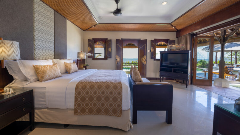 The master bedroom is located in a separate pavilion and has a distinctive waterfall to provide a calming and soothing atmosphere. This bedroom also features a Jacuzzi located within the ensuite bathroom in a separate private courtyard. The remaining four bedrooms are fully furnished with king-size beds and are found in places adjacent to the double story pavilion. They also enjoy ensuite bathrooms which are individually open air and feature al the modern bathroom amenities.