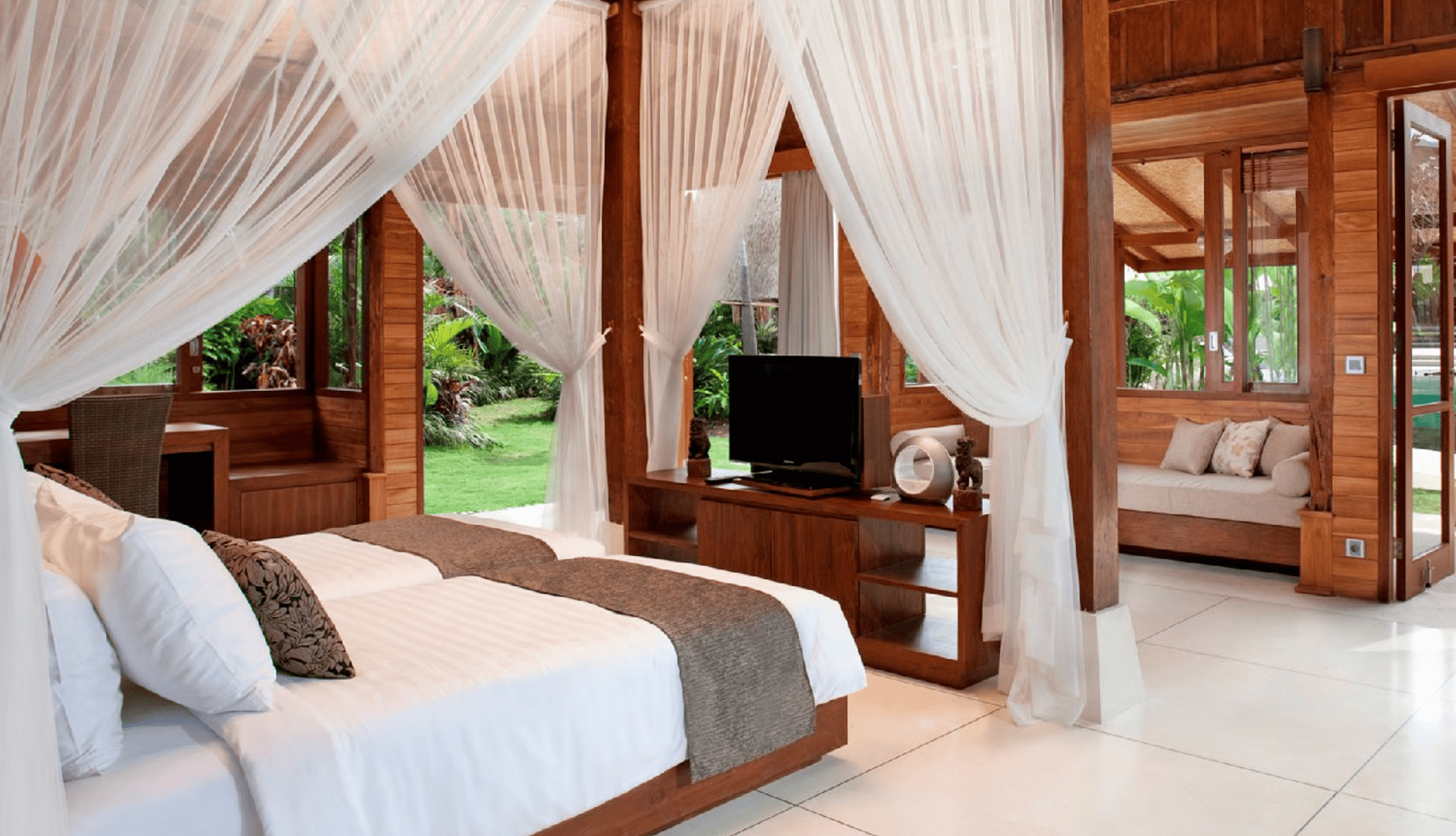 Dea Villas have separate living spaces for each villa consisting of a living room, a dining space, and a kitchen. The common factor in all indoor spaces is the priority that they have given to create a bright and airy space with the use of open walls and large glass windows. The living rooms mainly have two sitting areas, one fully relaxing space with a couch, and another area to watch TV. One of the most noteworthy features in every indoor living space is the traditional alang alang style roofs they have used which work as a decorative element as well.