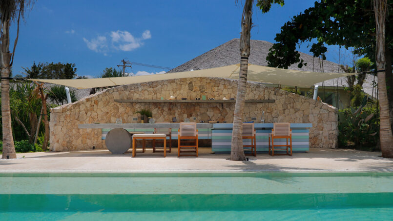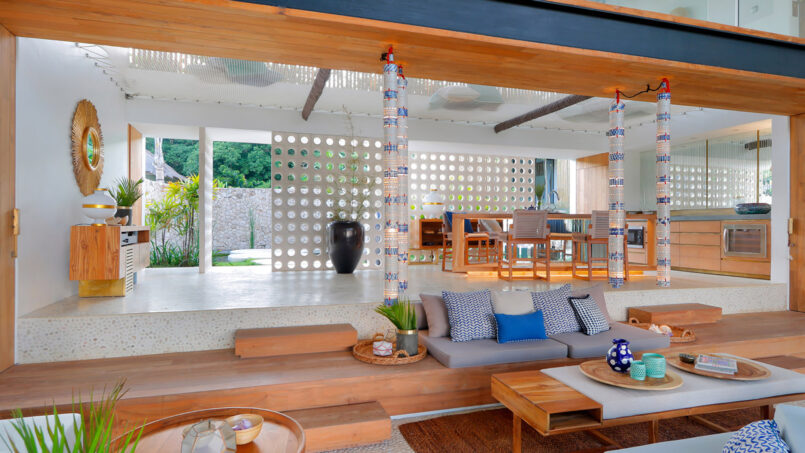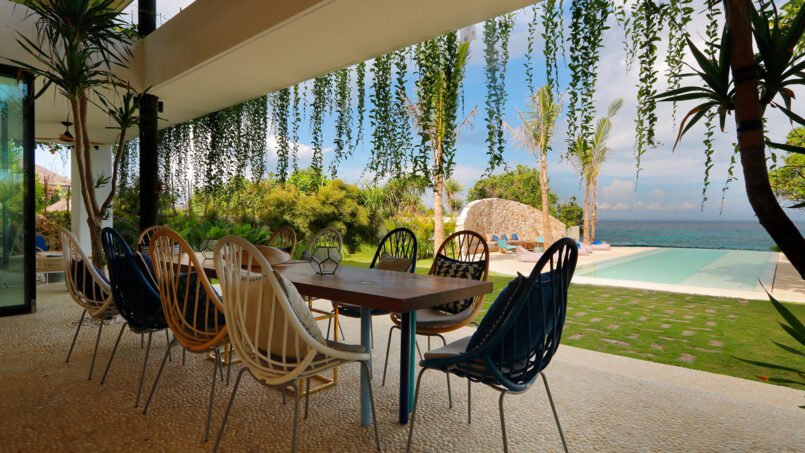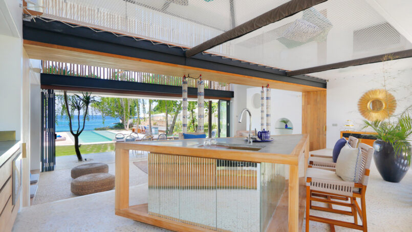 Located in Nusa Lembongan, Villa Seascape is a splendid beachfront holiday home which is unlike any beach villa you’ve ever seen. Featuring an aquatic, cruise theme across the interior and exterior of the villa, there are vivid shades of blue, round mirrors, and multiple circular mirrors, wall hangings, etc. including the sun deck that overlooks the ocean. Traveling with friends and family? The villa with its five-bedrooms will deliver in every aspect ranging from activities including water sports in the area, beach access, outdoor dining, indoor entertainment, and luxurious living.
