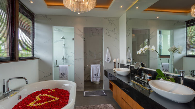 Walking into Tirtha Bayu Villa II, the vision of blue on blue will take your breath away, with the glistening water of the infinity pool melding seamlessly with the Indian Ocean beyond to create a sense of endless flow. There is beautiful symmetry too, with coconut palms, golden-tipped frangipani and lush gardens framing the view. The high-pitched roof of the central pavilion is inspired by traditional Torajan architecture, with the upper floor containing a sumptuous honeymoon suite flanked by a roof terrace with 360-degree views. The lower floor is an air-conditioned living area with two deluxe bedrooms on each side, accessed by a shaded veranda. The Torajan theme continues with elaborate hand-carved furniture and decorative reliefs throughout the villa.