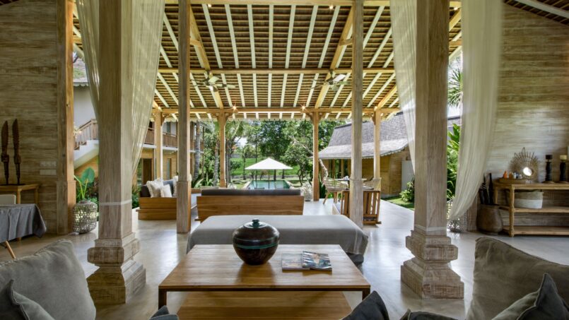The master suite is located in a private stand alone pavilion and overlooks the pool and rice fields. There couldn’t be a better view to wake up to and the tranquil rice fields of Kerobokan will surely fill your mind, heart and soul with peace and serenity. A large plush king sized bed occupies the center of the room. Facing the bed is a large flat screen TV. You may enjoy quality time with your loved ones lazing on the cozy bed, flicking through your favourite shows or movies after a long day of exploration. The room also has cabinets, drawers and a comfortable armchair at a corner. The enjoining private en suite bathroom is super stylish and luxurious, decorated with elegant contemporary lamps and fittings. This bathroom is complete with double sinks, a large mirror, bathrobes and towels, a large walk in shower, a large spacious wardrobe and a large al fresco stone bath tub where you may enjoy relaxing soaks under the tropical Balinese sky.