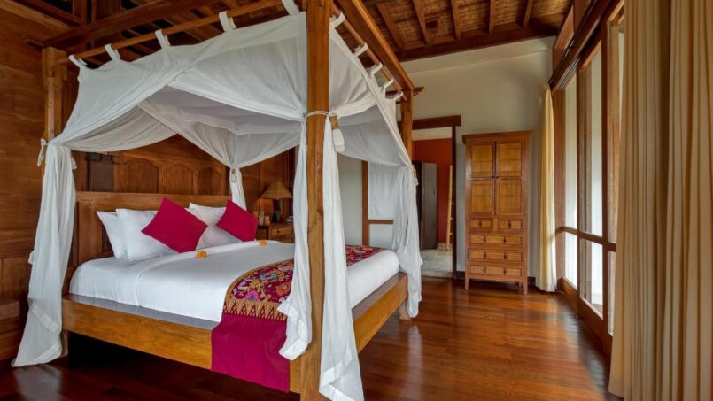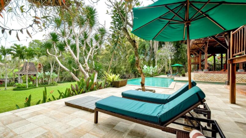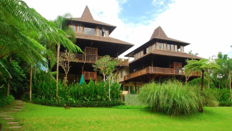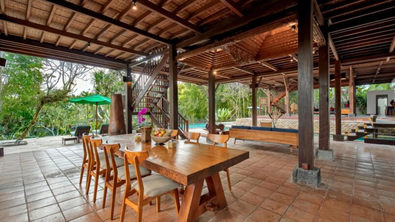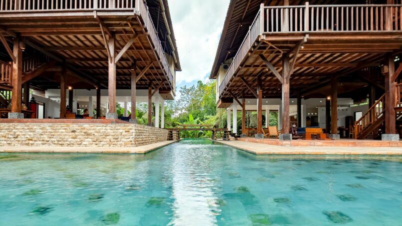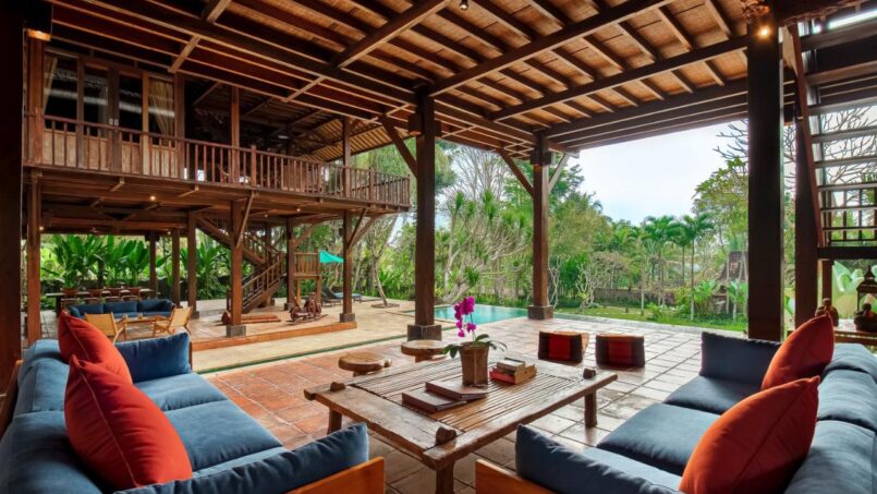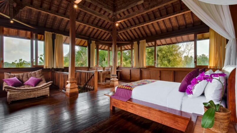 Villa Atas Awan is a seven-bedroom tropical retreat located just twenty minutes away from the center of Ubud. The villa provides its guest stunning views of Bali’s emerald green paddy fields and stunning volcanic formations. The villa is housed in two wooden structures replete with Balinese elegance. The tropical greenery that surrounds the estate and the glistening swimming pool together create an idyllic environment that is perfect for rejuvenating one’s self. The tranquil setting of the villa makes it an ideal vacation rental for large groups and even private events like weddings and yoga retreats.