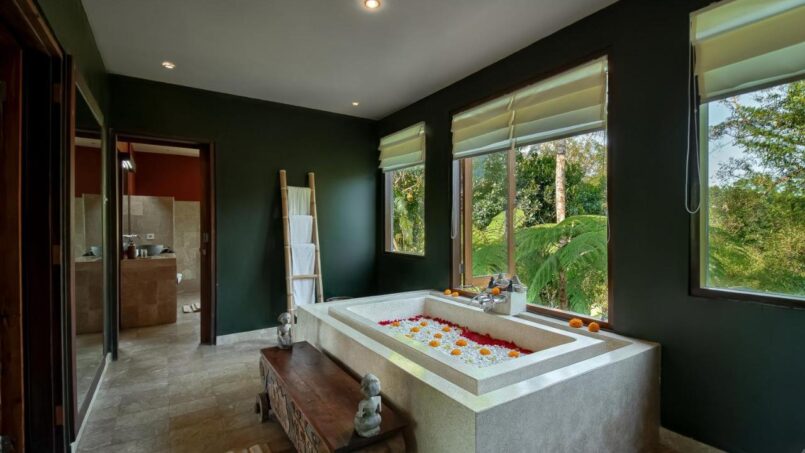 The seven bedrooms of Villa Atas Awan are tastefully designed with a seamless blend of modern aesthetics and Balinese design sentiments. The master suites located on the top floors enjoy sweeping views of the surrounding paddy fields. The rooms have glass doors to let in natural light and are equipped with king sized beds with luxurious linens, rattan sofas and private terraces to enjoy Balinese sunsets. The attached en suites are luxuriously equipped with tropical rain showers and sunken bathtubs. Comfort is never too far away.