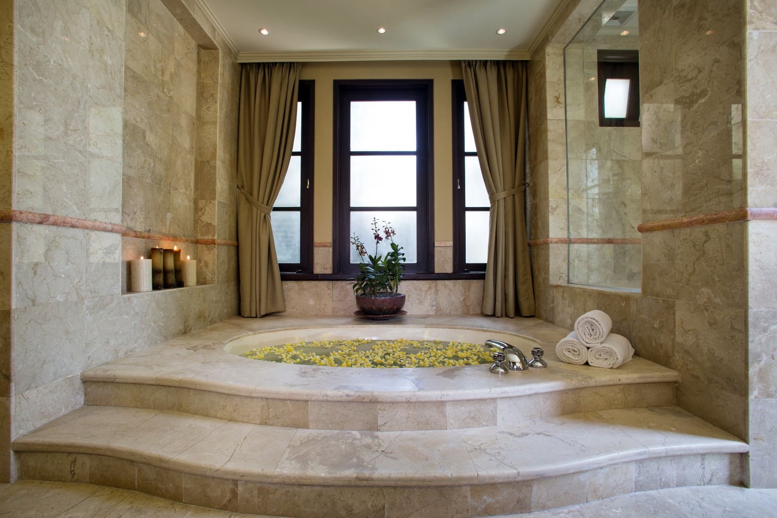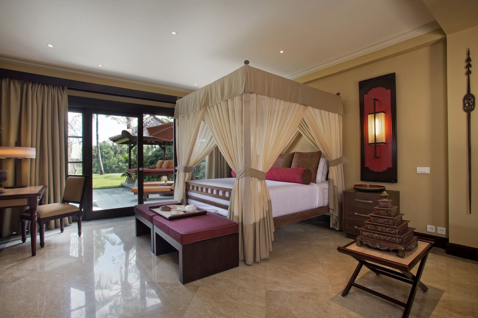 Villa Senja features a master bedroom on the ground floor styled with marble floors, a 4-poster bed and access to the large en-suite bathroom with a tub large enough for 2 people, a standing shower and double vanity. The master bedroom is designed with his and her dressing areas. There are doors which slide open allowing direct access to the swimming pool.