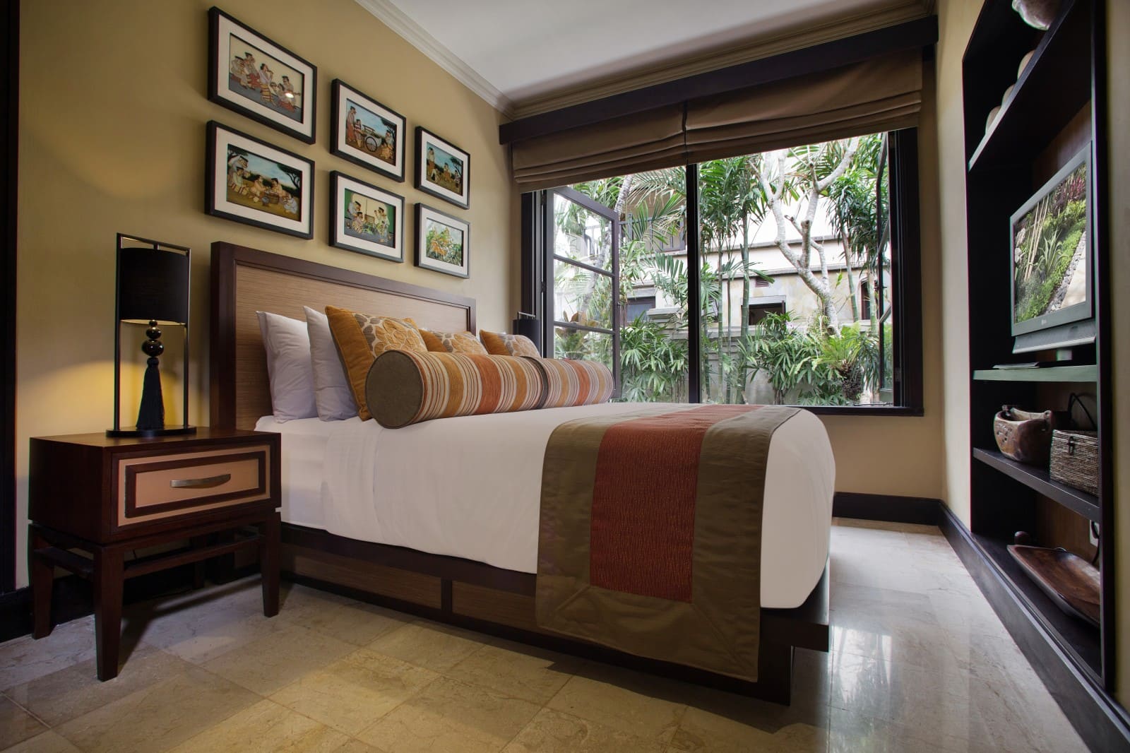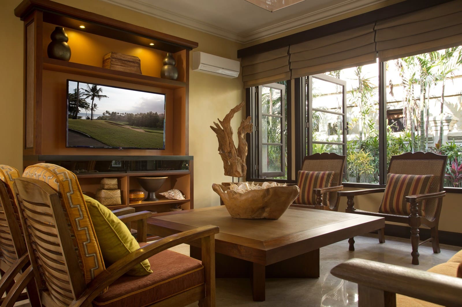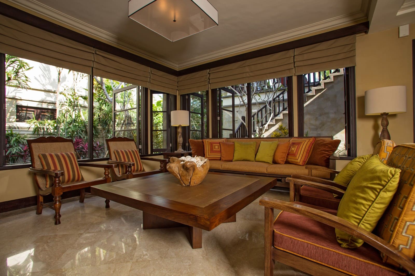 The villa entrance is through traditional Balinese gates and a palimanan stepping stone path leads you to the villa. The gorgeous lush tropical landscaped garden, with scented frangipani, swaying palms and a fishpond with stone fountain, provides a fragrant and serene environment.