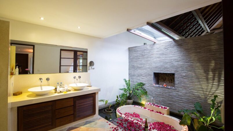 Villa Seriska has not one but two master suites, one furnished with a king-sized bed and the other with a queen-sized bed. Each bedroom also features a daybed, for additional comfort. The traditional design is highlighted due to the high-vaulted alang-alang ceiling and the elaborate wooden headboards behind the bed. With antique desks and stools, the rooms stand out with their unique décor. The en-suite bathrooms are nothing short of surprising as one of them features a freestanding bathtub in the midst of a pond, and the other a soaking bathtub beside trees!