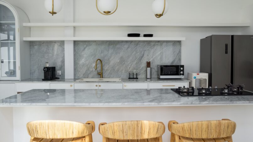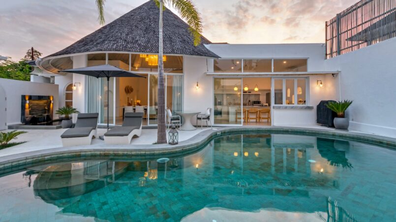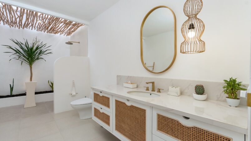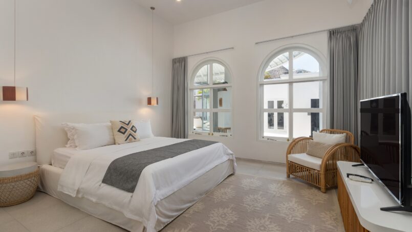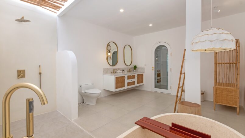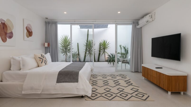 Villa Weiss boasts three exquisitely designed bedrooms, each a sanctuary of comfort and style. The rooms are characterized by their expansive layouts, airy ambiance, and a soothing white color palette. Natural light floods through the large windows, creating an inviting atmosphere. Each bedroom features a king-size bed, a Smart TV for entertainment, and an ensuite bathroom complete with a luxurious bathtub, promising ultimate relaxation.