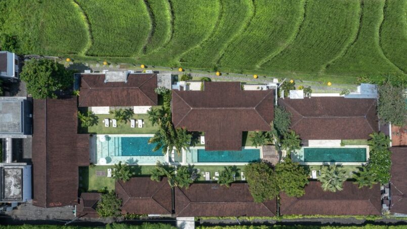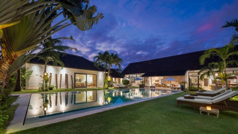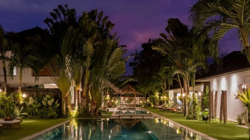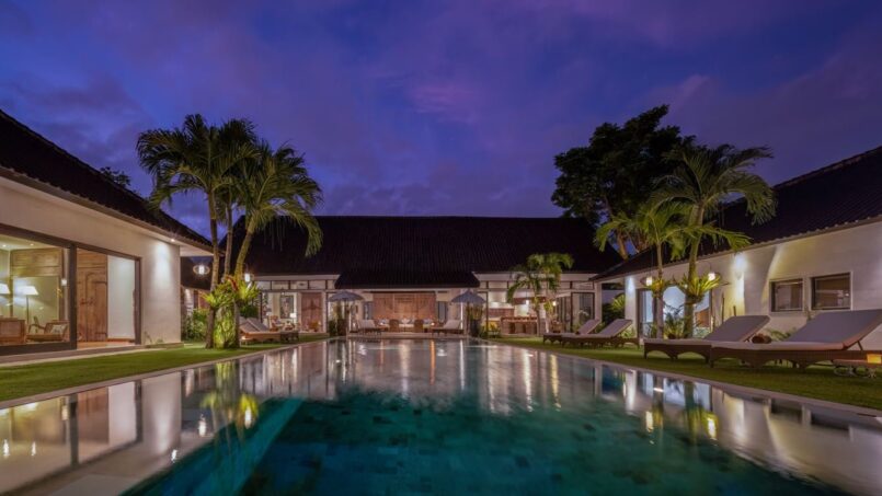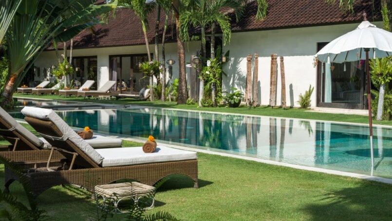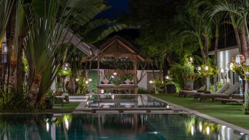 The complex houses four beautiful blue swimming pools. Guests may choose to swim between the two eighteen meter pools, seventeen meter pool and thirteen meter pool. By the side of each pool are cozy sun loungers where you may curl up with a book to enjoy the tropical sun. The eighteen meter pool also has a traditional bale with see through glass floors to watch the fish pond below. The gorgeous green gardens have been decorated with tropical plants and flowers and Balinese palms.