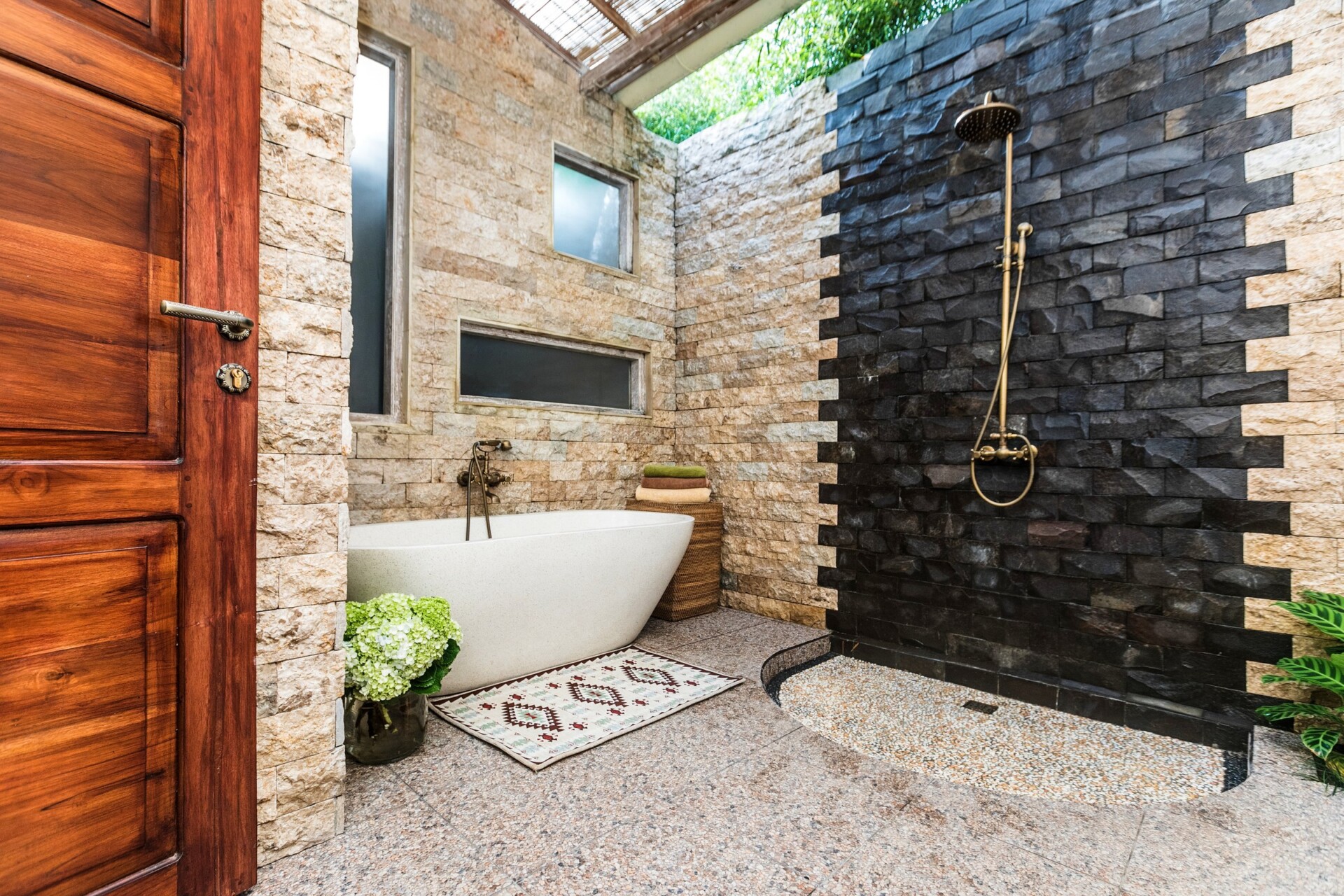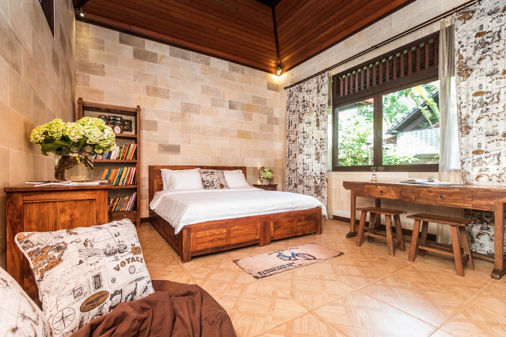 There is a bookcase in the larger bedroom with a work desk or sitting for two. Bean bags, rugs, etc. make for accouterments that you may use. Both bedrooms have ensuites and one is semi open-air with a rain shower and bathtub.