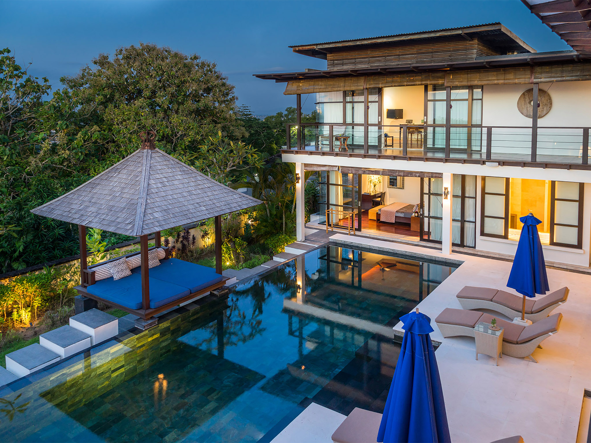 The beautiful hills and the pristine ocean in Bukit Peninsula, Jimbaran can be best enjoyed in the Villa Adenium. The villa is tastefully located on a hilltop with promising views of the lush green surroundings and the blissful blue ocean waters. The huge property occupies a massive area of seven hundred square meters where the built up area is about six hundred square feet sprawled over two levels. This quaint villa can house a maximum of eight guests at once. The wooden décor topped by the buoyant green surroundings can truly bring one close to nature away from the hustle and bustle of the daily busy lives.