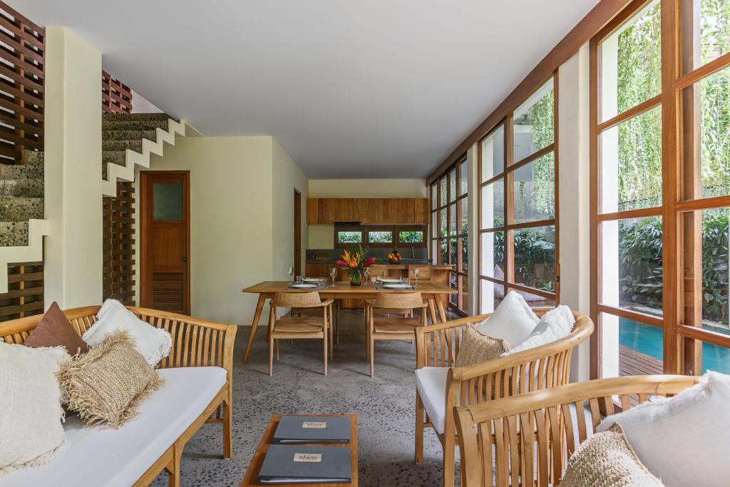The villas feature a terrace, pool views, a seating area, a flat-screen TV, a fully equipped kitchen with a refrigerator and microwave, and a private bathroom with a bidet and free toiletries. Some units also include a dining area and/or a balcony.