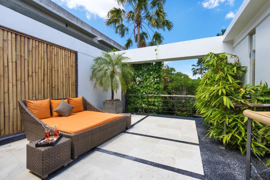 The garden of Villa Anjali Orange is a green colored oasis with many tropical plants and a lush lawn of grass beautifully manicured and maintained by the villa staff. The 8-meter swimming pool comes with a safe shallow end for your little ones to splash about, and the entire garden is very much child-friendly, giving a beautiful and free space for them to run about enjoying their tropical vacation in their own way. On the sunlit pool deck you can find a row of rattan lounge chairs waiting for you to lie down and bask in the sunlight while breathing in fresh air fragrant from the exotic blooms around you.