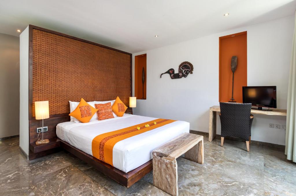 The rest of the furniture in the bedrooms are very minimal; a weathered bench at the foot of the bed, a simple work table with an armchair on which a medium-sized flat screen tv is placed when you want a little bit of entertainment to enjoy from the bed. The room also comes with a modern semi-outdoor bathroom with dual showers – one indoor and one set outside in a small tropical garden setting under the sky.
