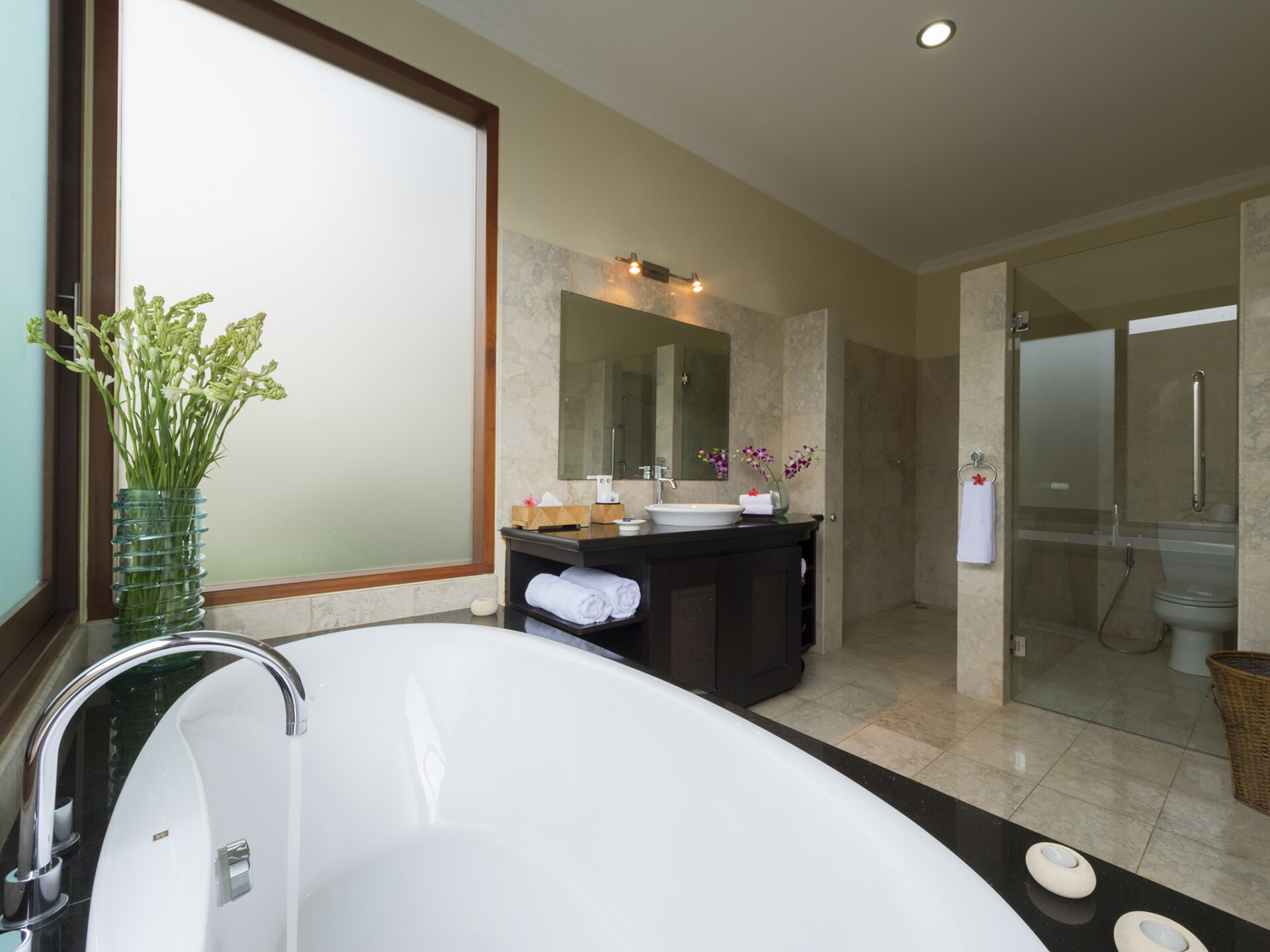The villa houses four bedrooms of which two are master suites and two guest bedrooms! Perfect for a gathering of families and a large group of friends or even a corporate retreat, the villa is especially well-suited if you’re looking to book for a social event.