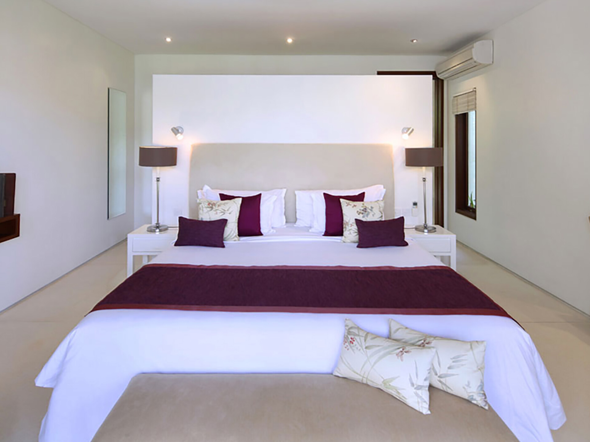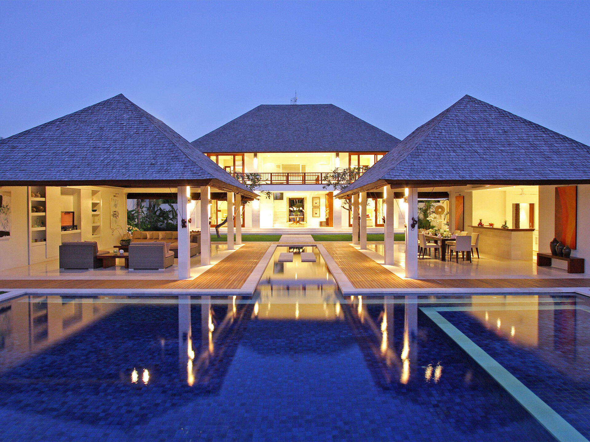 The Villa consists of 4 bedrooms which are complete with its own air-conditioning facility, TV set, and ensuite bathroom. 2 bedrooms found on the ground floor are furnished with king-sized beddings and floor-to-ceiling sliding, wooden-framed glass doors. The other two bedrooms can be located on its upper floor – one with a king-sized bed and another with two single beds. Its spacious en suite bathroom may feature a soaking-bathtub, shower facilities, and twin vanities.