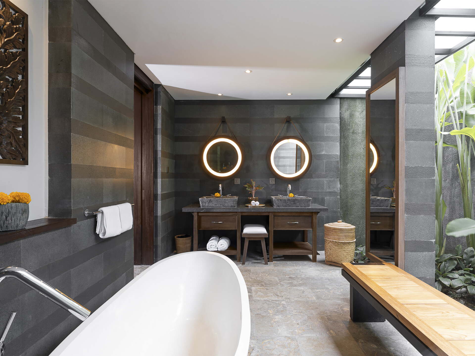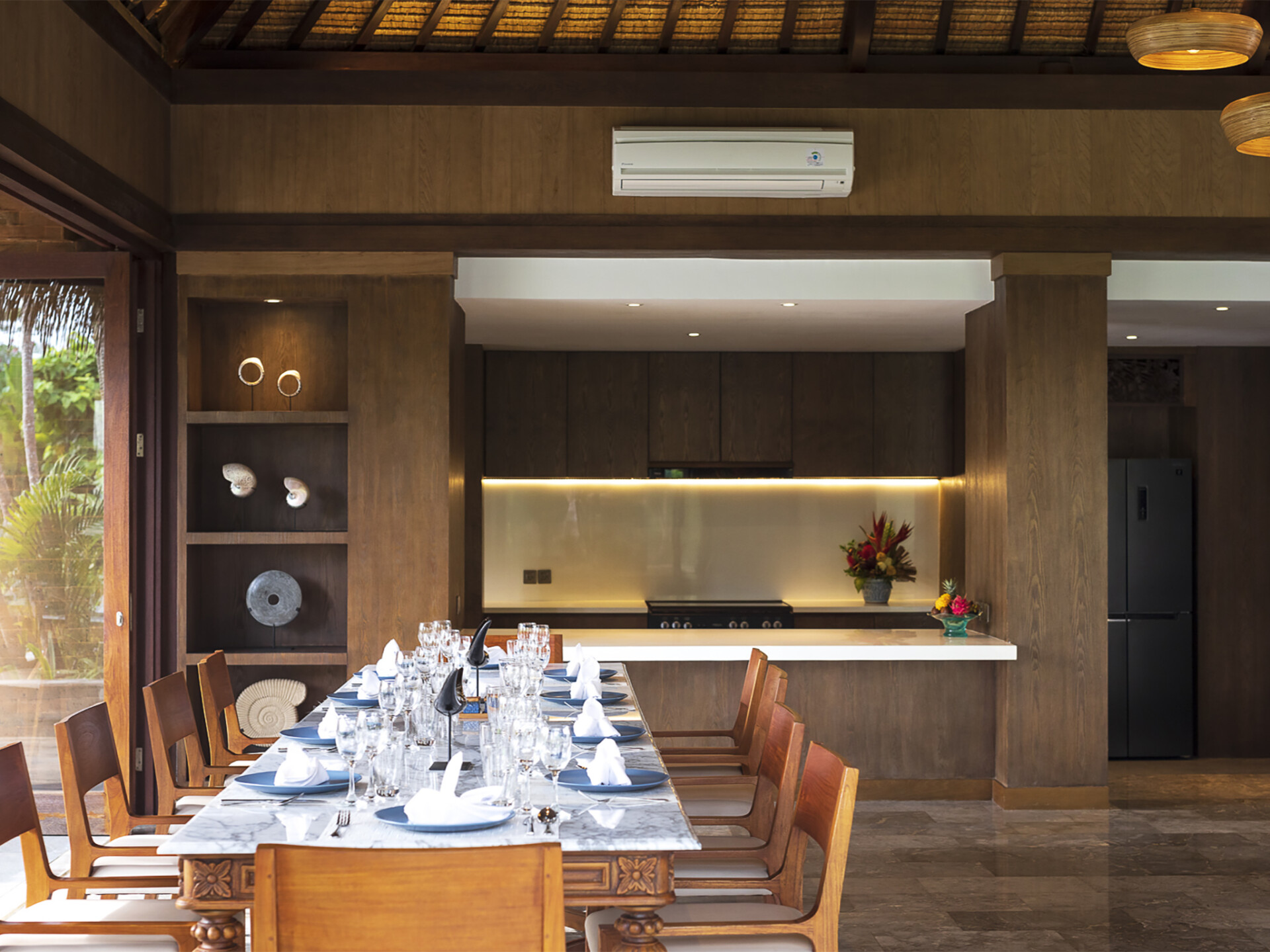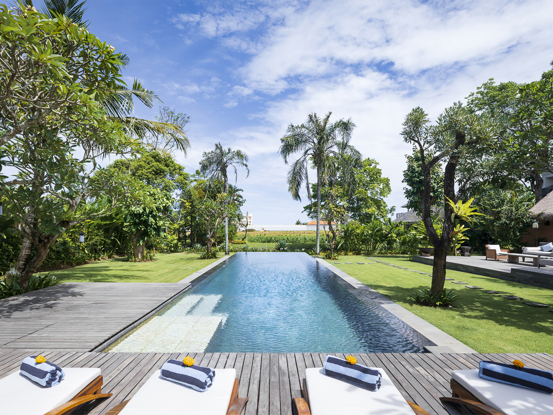 The design is a skilful blend of traditional Balinese architecture and 21st Century luxury, with a layout that is perfectly crafted for multiple, or multi-generational, families. Within the handsome interiors, acres of marble or tropical timber floors dotted with beautifully curated modern and heritage furniture sweep under soaring vaulted ceilings.