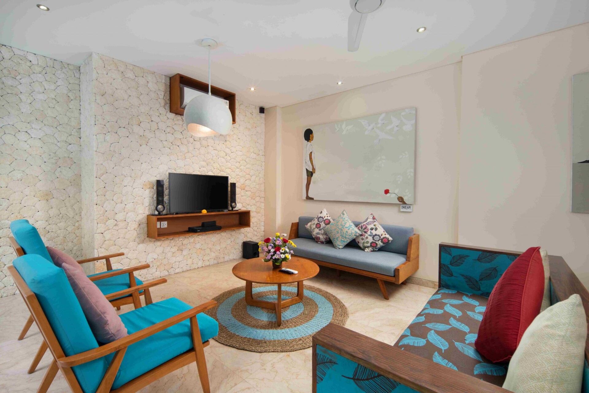 The open-concept living room spills out onto the pool deck while there are exquisite designer walls extending up to the second floor. Bamboo stalks form a fence around the villa for added privacy while you relax in the pool. Villa Tiga is suitable for a family holiday with children as there is abundant room for everyone and modern amenities for comfort.