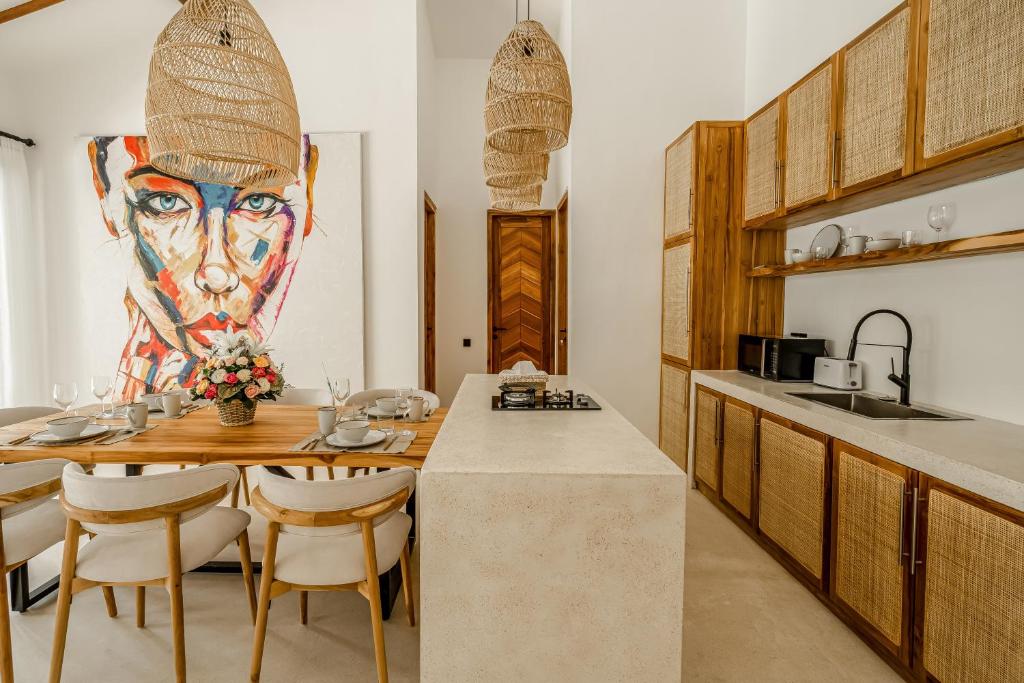 Each villa features a private terrace with pool views, a cozy seating area, flat-screen TV, and a fully equipped kitchen complete with refrigerator and microwave. The private bathroom includes a shower and complimentary toiletries for your convenience.