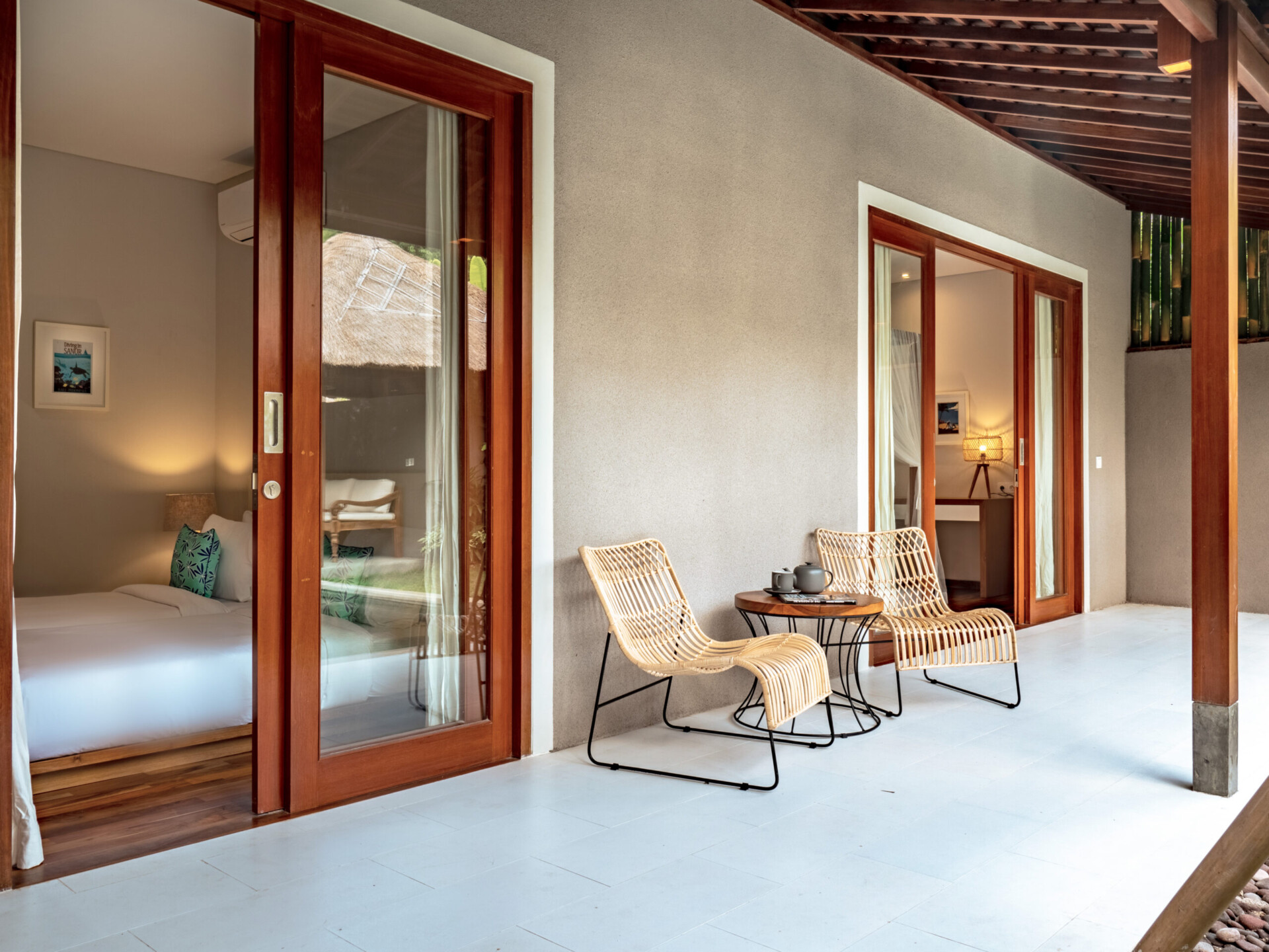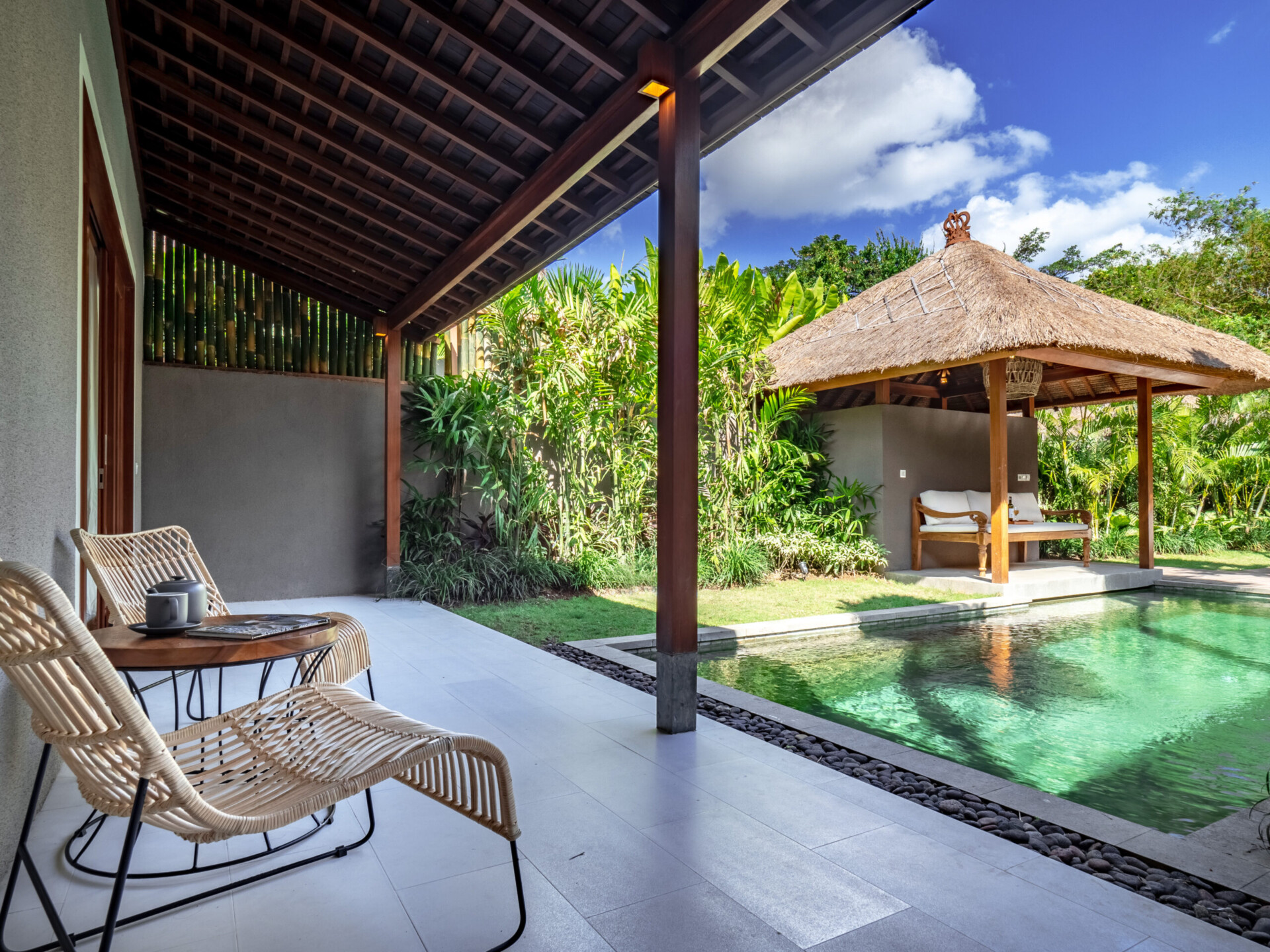 Villa Gardenia Bumbak boasts three elegantly designed bedrooms, each offering a harmonious blend of comfort and style. Two of the rooms feature king-sized beds draped with soft canopy fabric, creating a romantic ambiance. The third bedroom offers twin beds, ideal for children or friends. Large glass doors open to lush gardens, allowing ample natural light and fresh air to fill the rooms, making each morning a delightful experience.