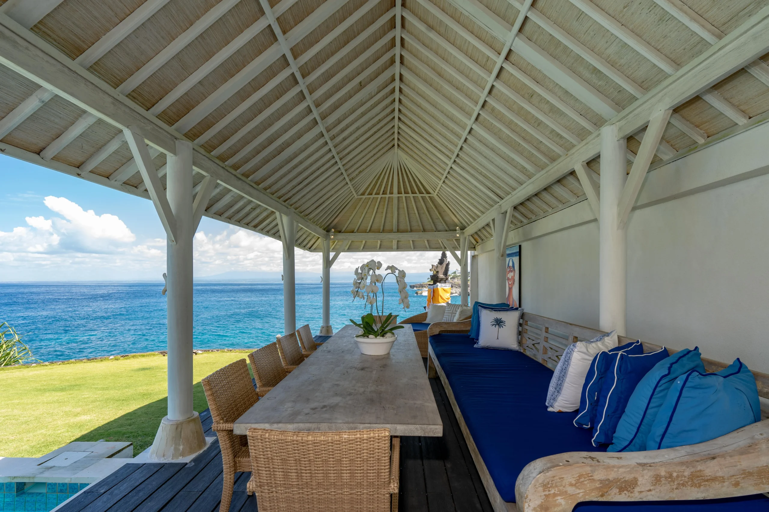 The opulent master bedroom is found atop the cliff in the corner of Casa Del Mar which is the perfect spot to enjoy views of the ocean. The bedroom is furnished with a king-sized bed and is air-conditioned for a refreshing and cool ambiance. There is a comfy daybed in the room as well, along with a writing desk. The en-suite bathroom features a lavish bathtub which has stunning scenes of the outdoors.