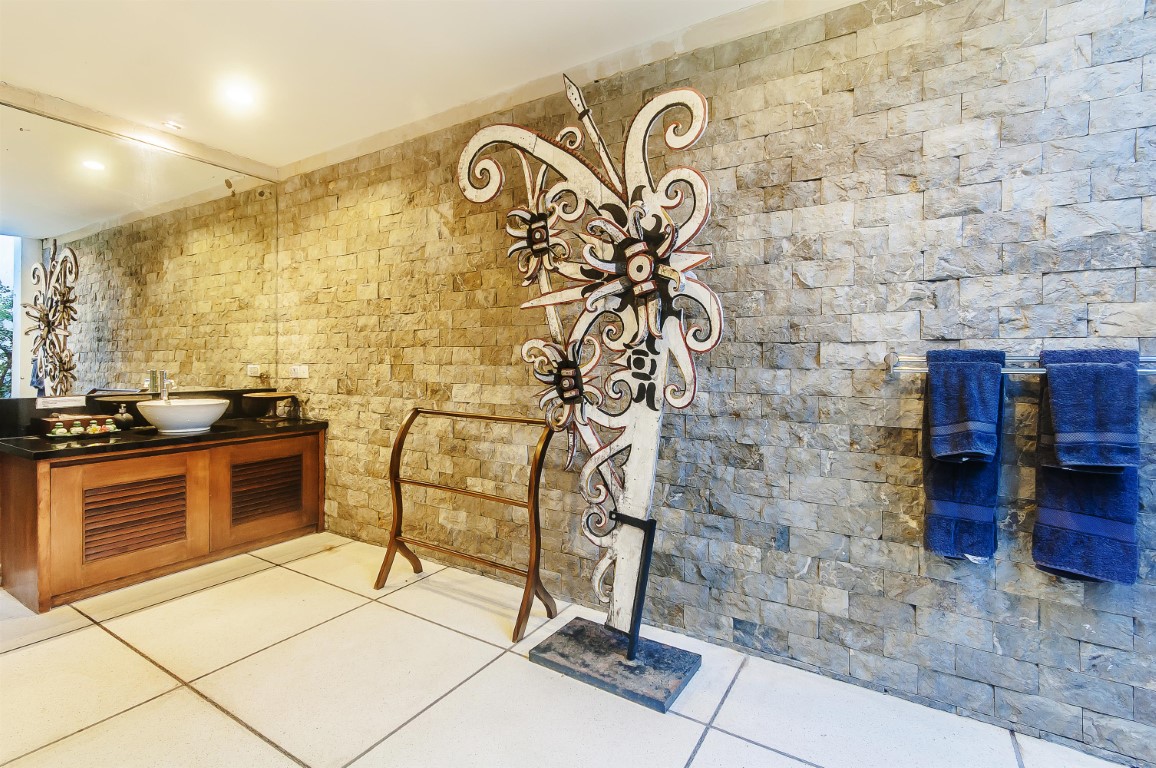 Villa Damai boasts three exquisite bedrooms that are designed for ultimate comfort. Across the pool, the master suite is a private haven accessed via Palimanan stone steps. It features a king-sized bed, air conditioning, ceiling fan, wardrobe with a safe, and a luxurious en-suite bathroom complete with a bathtub and open-air shower surrounded by greenery. Two additional guest pavilions face the pool and garden. Each room comes with a king-sized bed, air conditioning, a ceiling fan, a safety deposit box, and an en-suite bathroom with both bathtub and open-air shower. These rooms are designed to offer privacy, comfort, and tropical elegance.