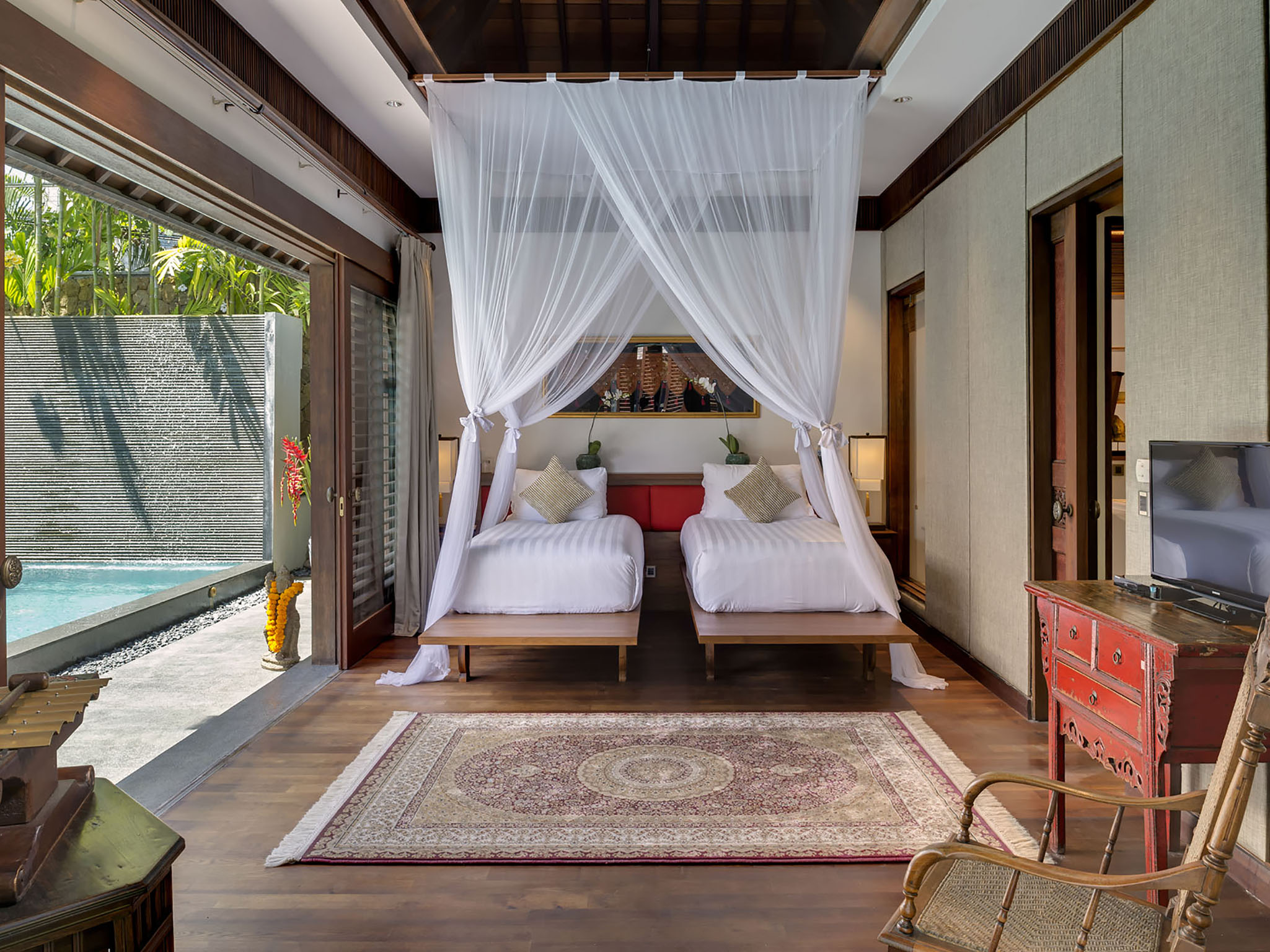 Villa Des Indes 2 offers a total of 5 bedrooms that are divided between 3 pavilions. The master bedroom offers a king bed and ravishing teak wooden interiors that goes perfectly hand in hand with the simple color scheme of the room. The bathroom of this room features a free-standing bathtub and rain-shower. The room also offers a TV and other important furnishings such as a safety deposit and a built-in closet.