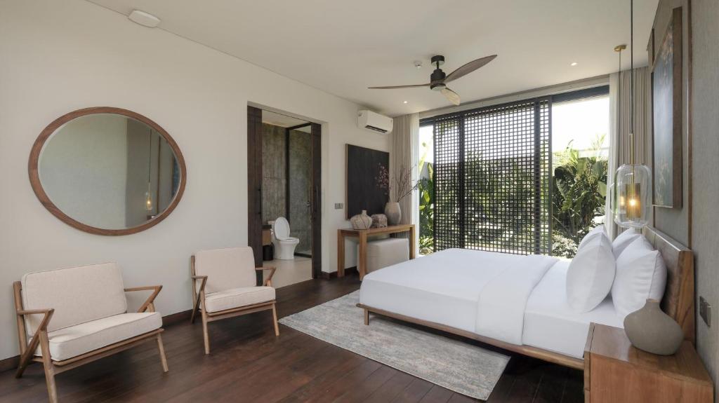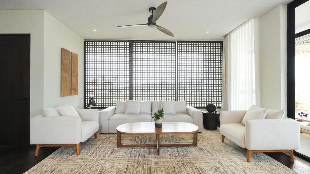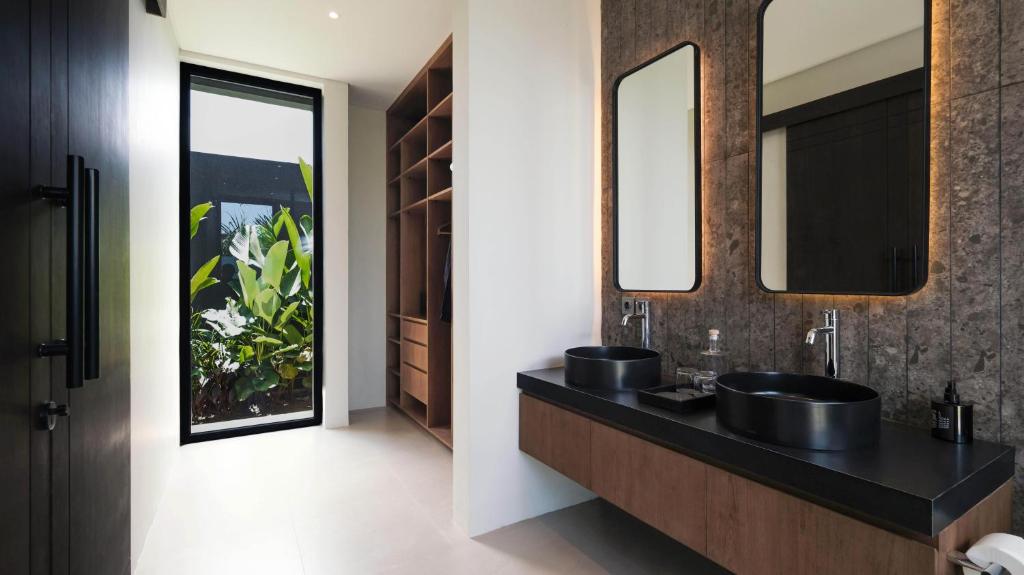 Nestled in the peaceful area of Pererenan, Five Palms Villa 4 provides a tranquil getaway surrounded by lush rice fields and sleek modern architecture. This stunning 3-bedroom villa seamlessly blends contemporary style with natural beauty, offering a relaxing retreat just a short walk from the beach. The spacious outdoor areas, including a unique rooftop pool, invite guests to unwind while enjoying the breathtaking surroundings.