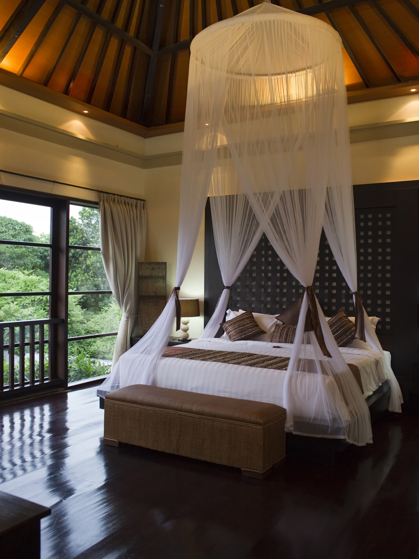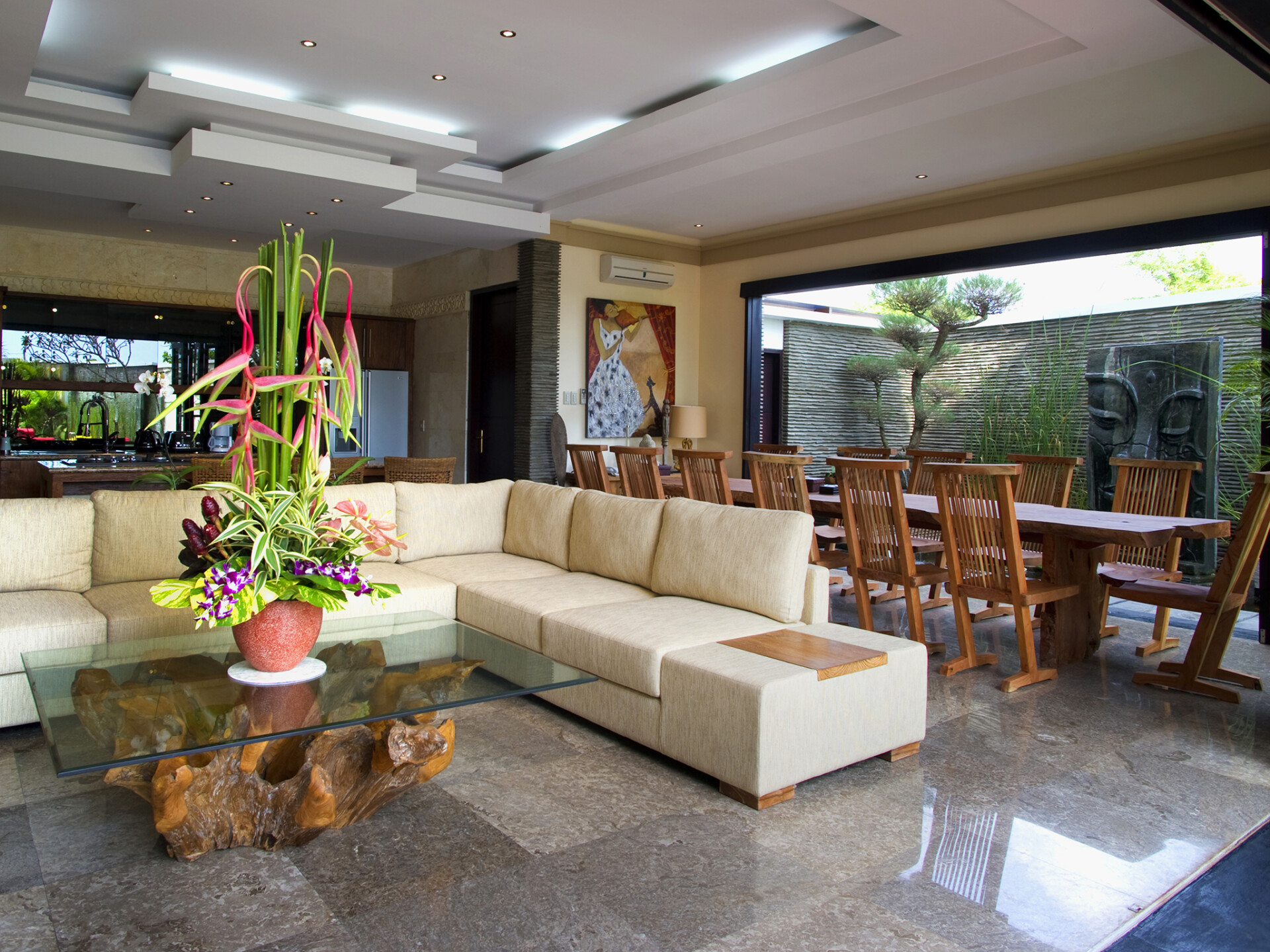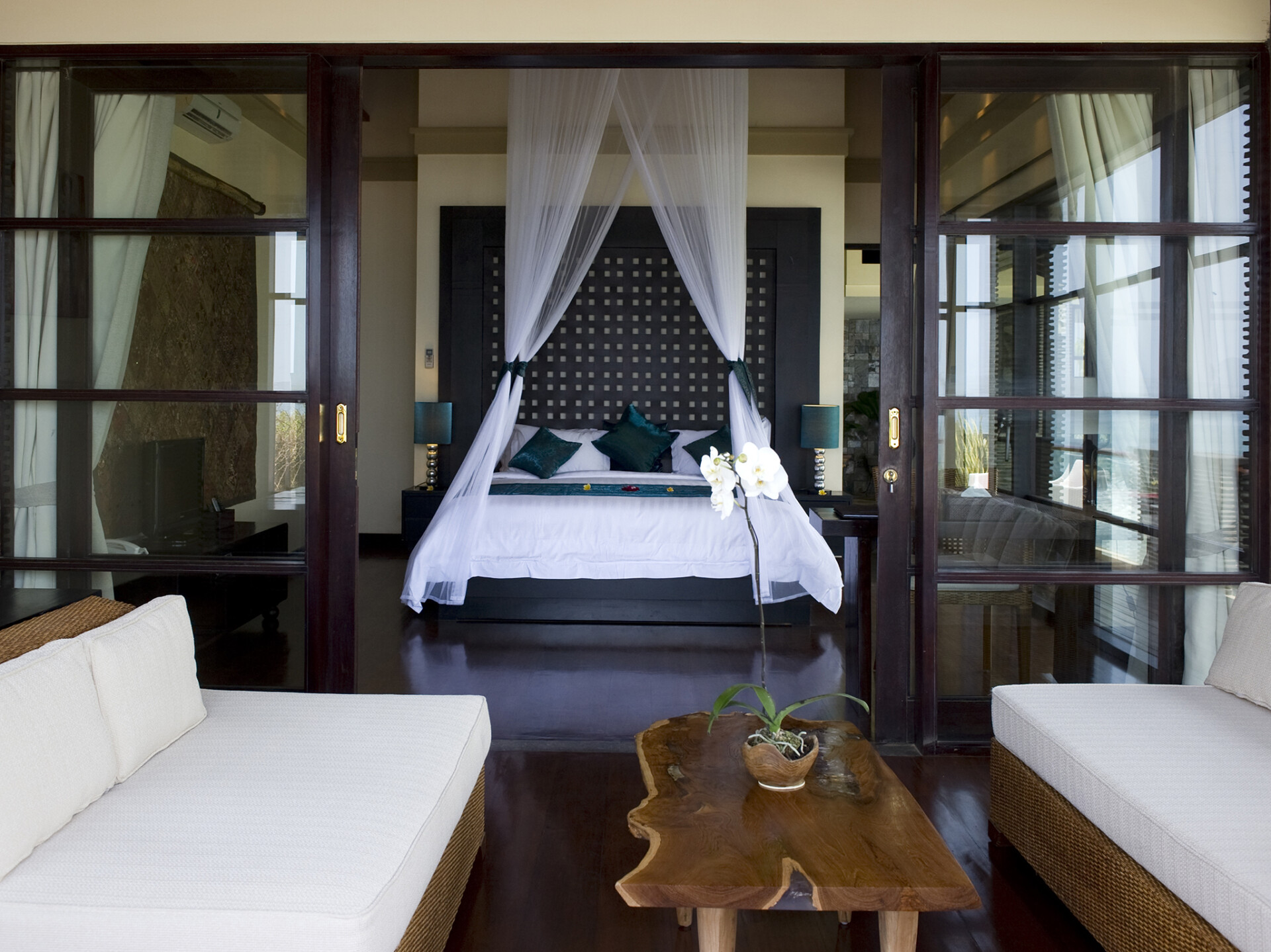 Villa LeGa has five bedrooms equipped with all modern facilities. All five bedrooms have king size divinely canopied bed and have en-suite bathrooms. To enhance scenic beauty and to increase comfort inside bedrooms, you can find other royal furniture like chairs, sofas and other furniture. The interior design of the house is like, three bedrooms are located upstairs. Each of the three bedrooms has its own private balcony offering eye soothing ocean view and tropical foliage. The other two bedrooms are located at the ground floor on the straight way to swimming pool . There are other rooms which have their own small and private living area where you can lie down and relax and recharge for the holiday.