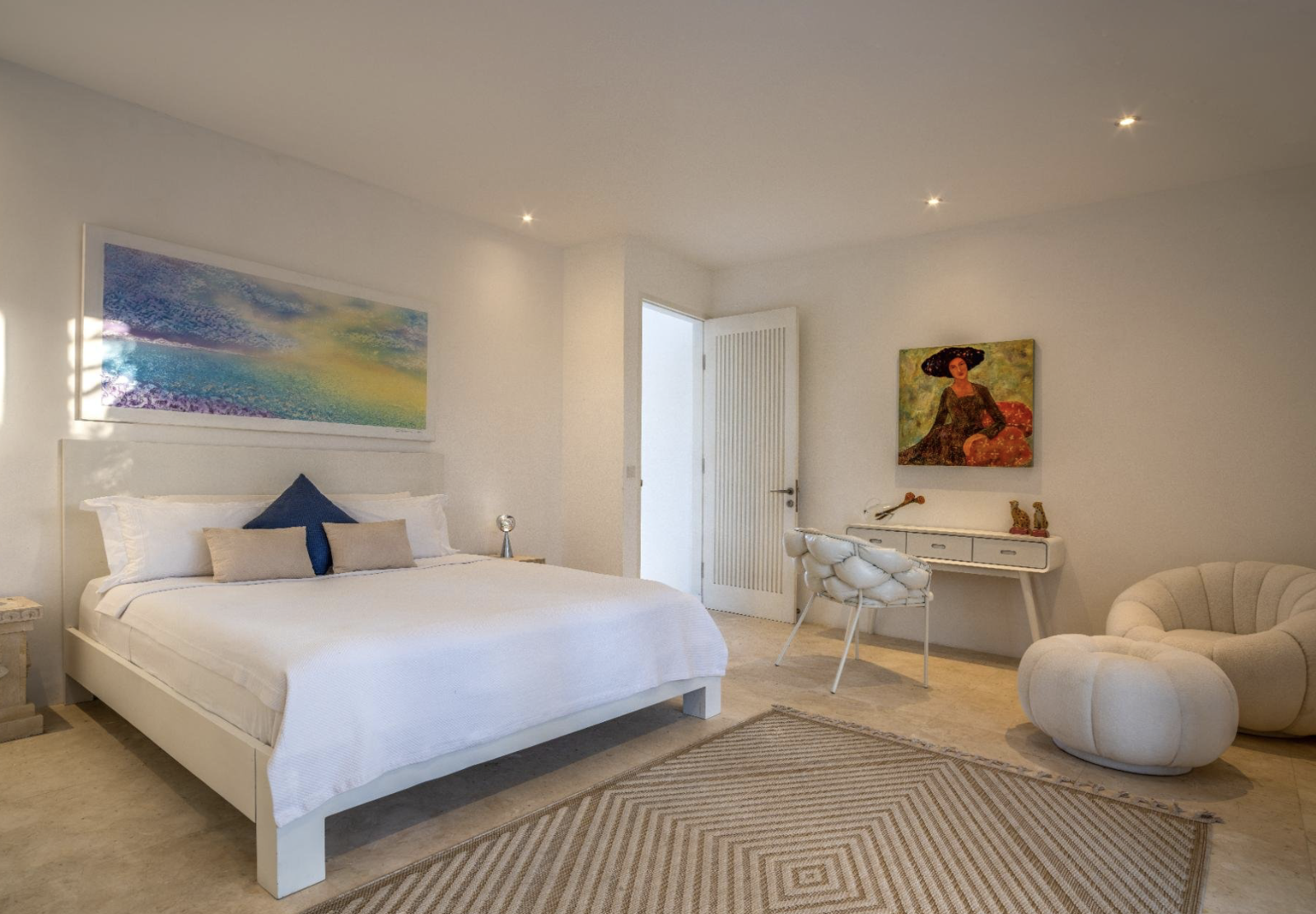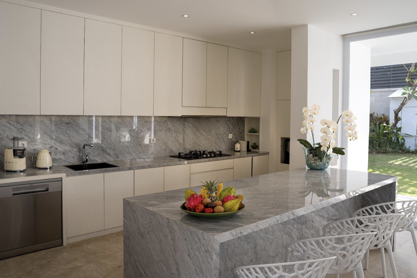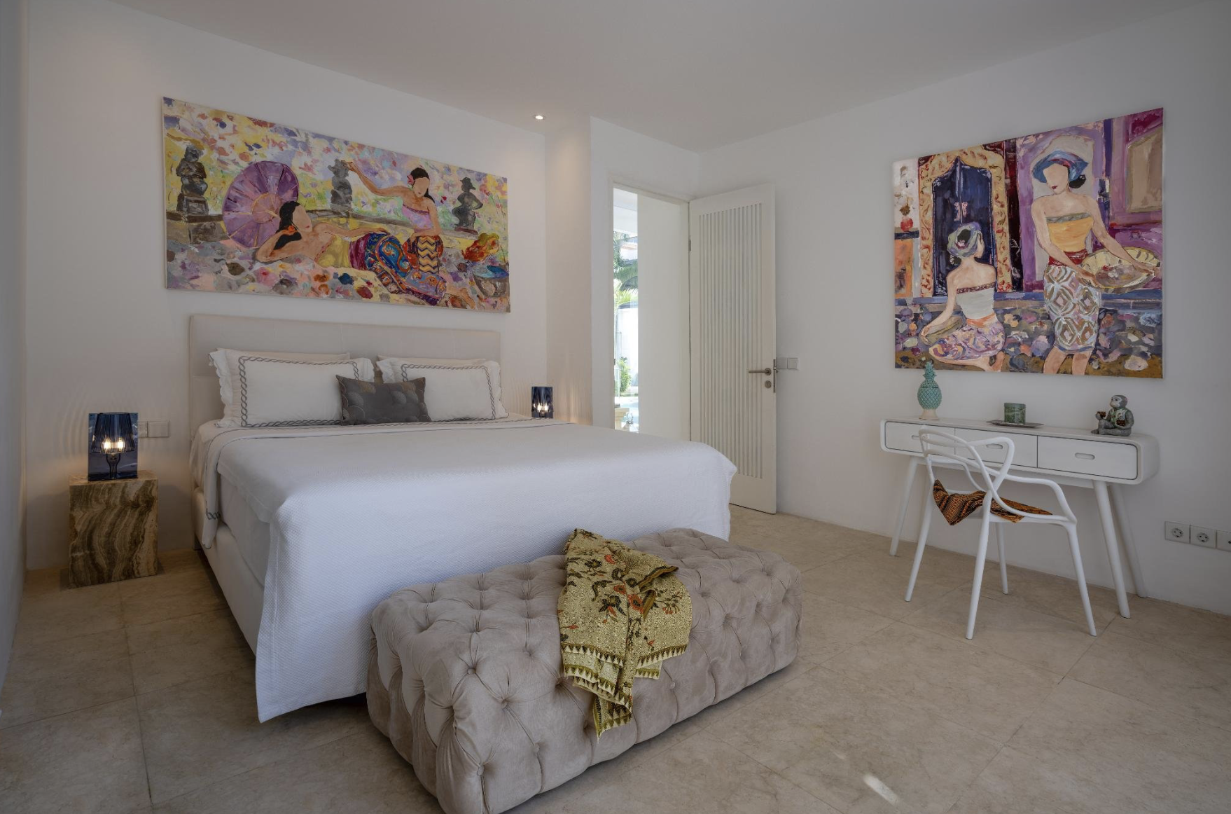 The interior of Villa Manis Cantik is a seamless blend of modern white aesthetic and traditional charm. The open-plan living spaces are designed with elegant furnishings and neutral tones, providing a soothing ambiance. A sleek, fully equipped kitchen with state-of-the-art appliances and a stylish dining area invites guests to enjoy culinary creations. The villa also features a cozy living room, perfect for family gatherings or quiet relaxation.