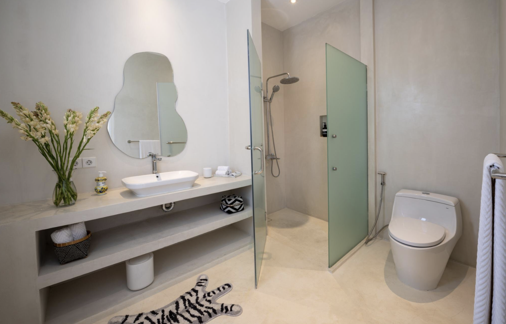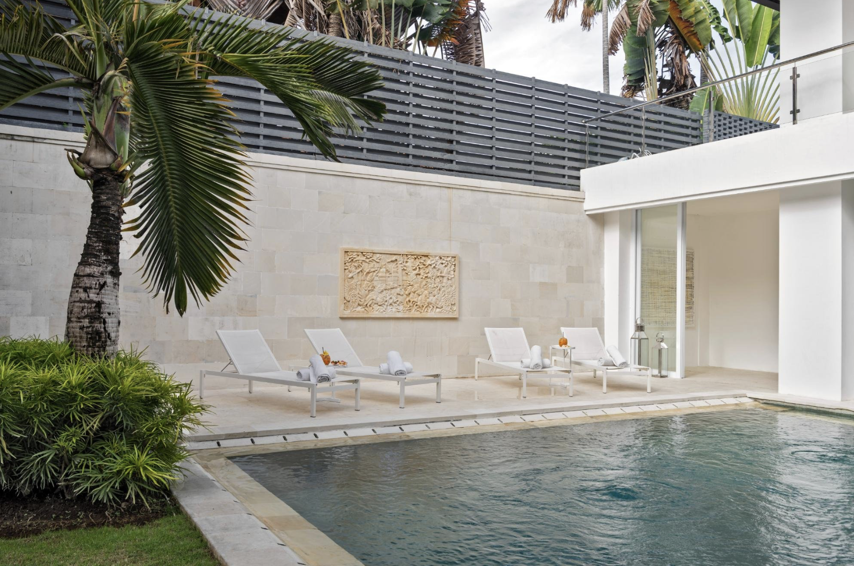 The outdoor spaces at Villa Manis Cantik are nothing short of spectacular. The centerpiece is a generously sized private swimming pool surrounded by plush sun loungers and verdant tropical garden. An outdoor dining area provides the perfect spot for al fresco meals under the Bali sun. The sophisticated landscaping and design create a sanctuary where you can unwind and enjoy the serene environment.
