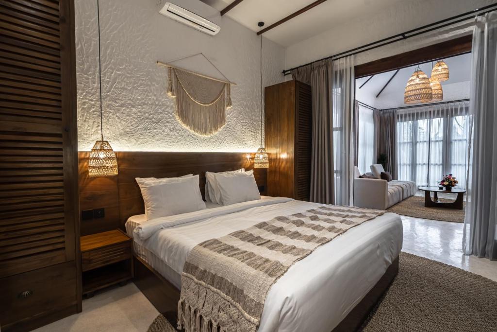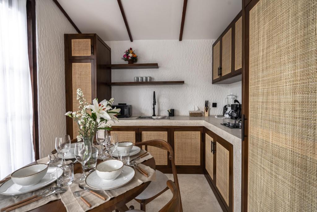 The villa includes a private patio with pool views, a comfortable seating area, a flat-screen TV, a fully equipped kitchen with a refrigerator and microwave, and a private bathroom with a shower and complimentary toiletries. Additional amenities include a stovetop, toaster, and electric kettle.