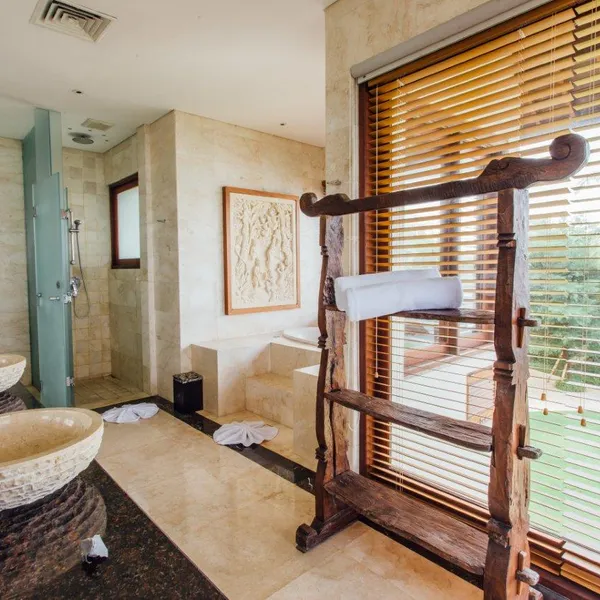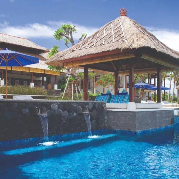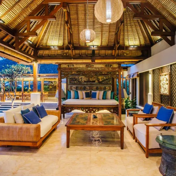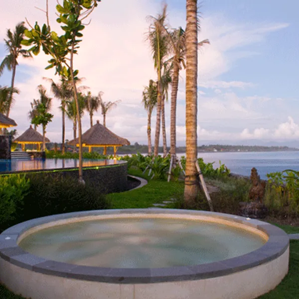 This water-themed villa is epitomized by its multi-level infinity pool and pond, and Jacuzzi. Puri Salila features a private beach bar or turret lounge, outdoor showers, extensive gardens to explore and panoramic vistas of Mount Agung and the Indian Ocean.