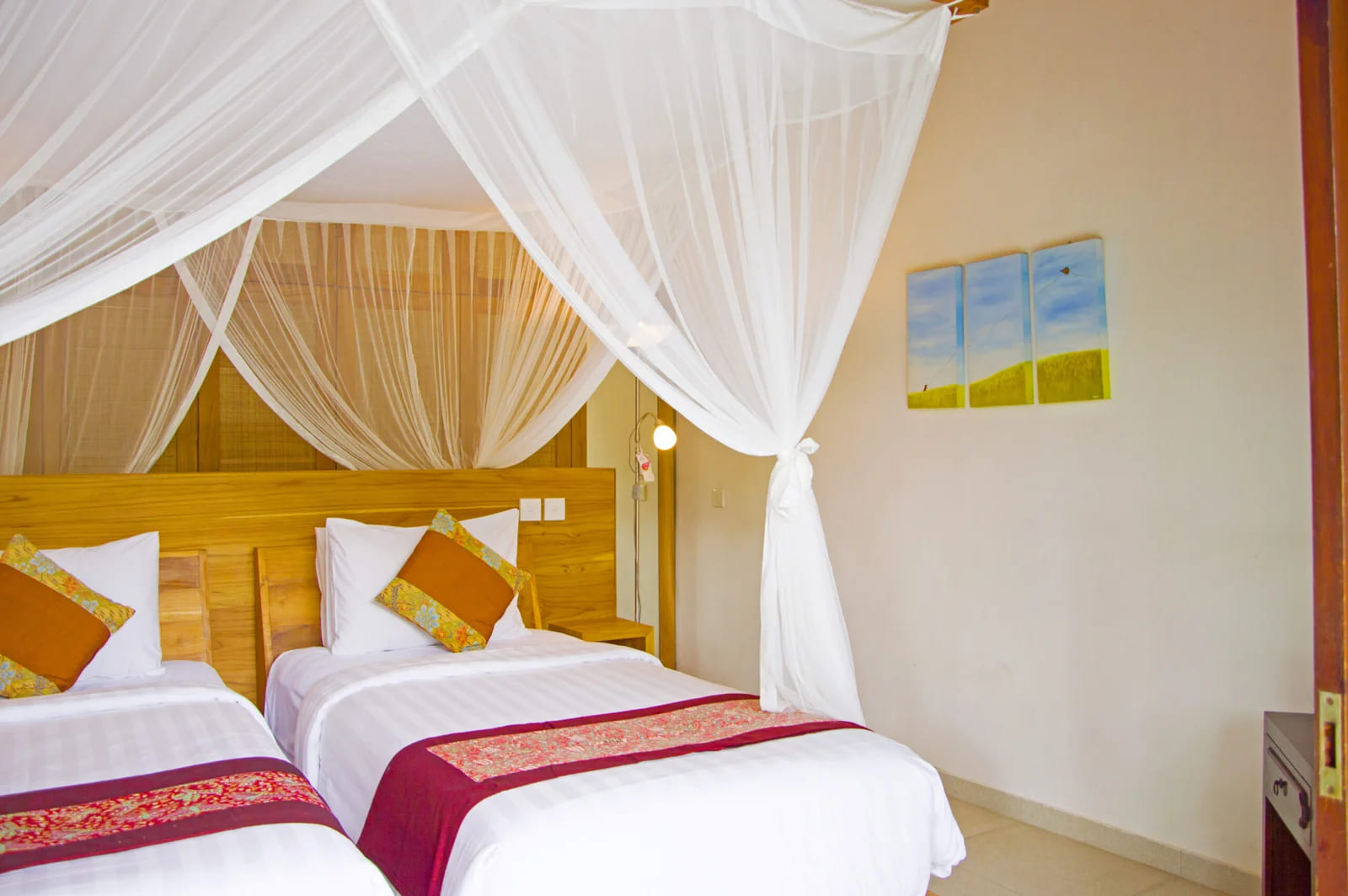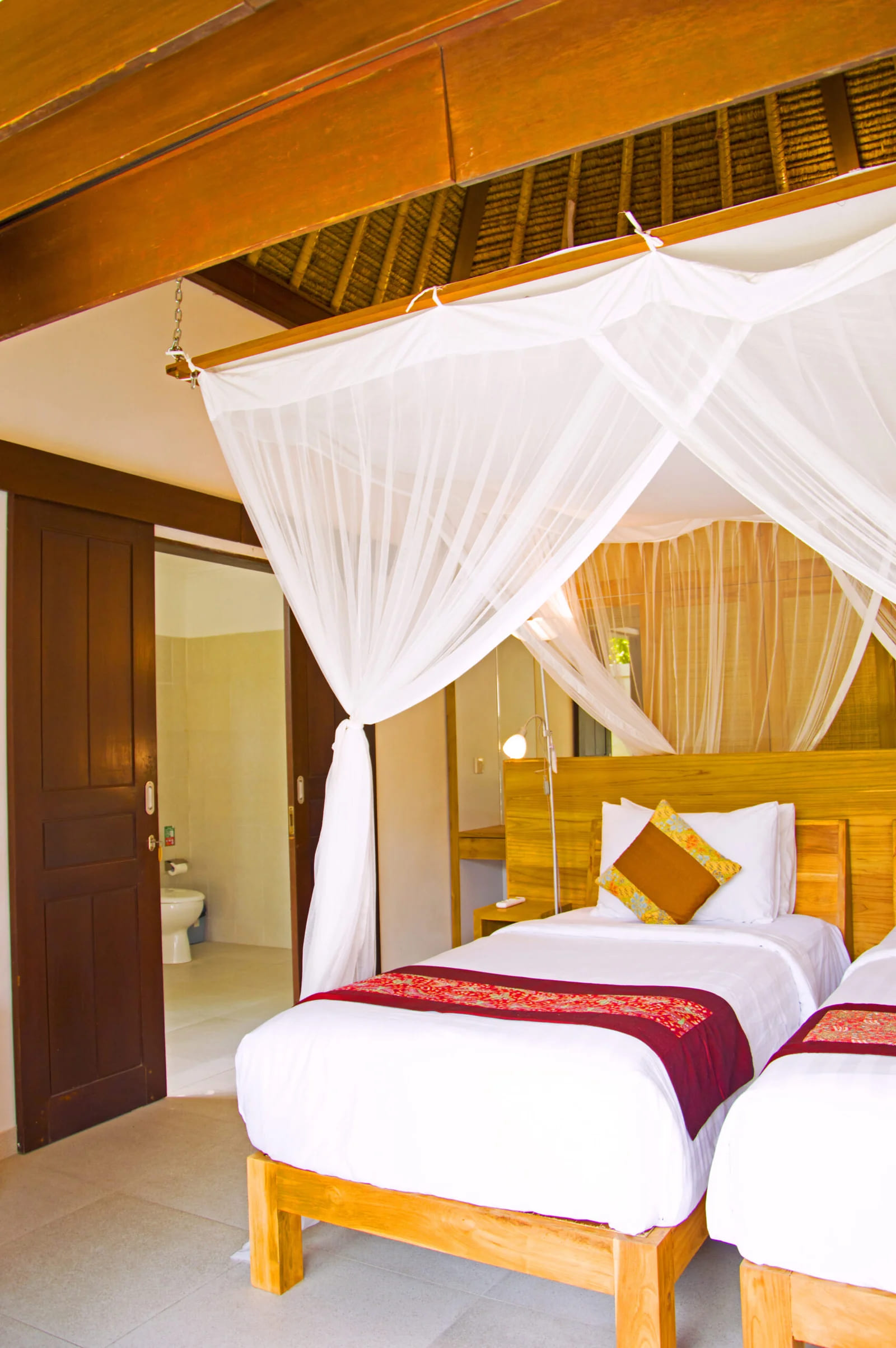 The thatched ‘Alang Alang’ roof is quintessential Bali, with the master bedroom attached to the main building, and the 2 guest houses are built right over the large central pool with sun lounges.