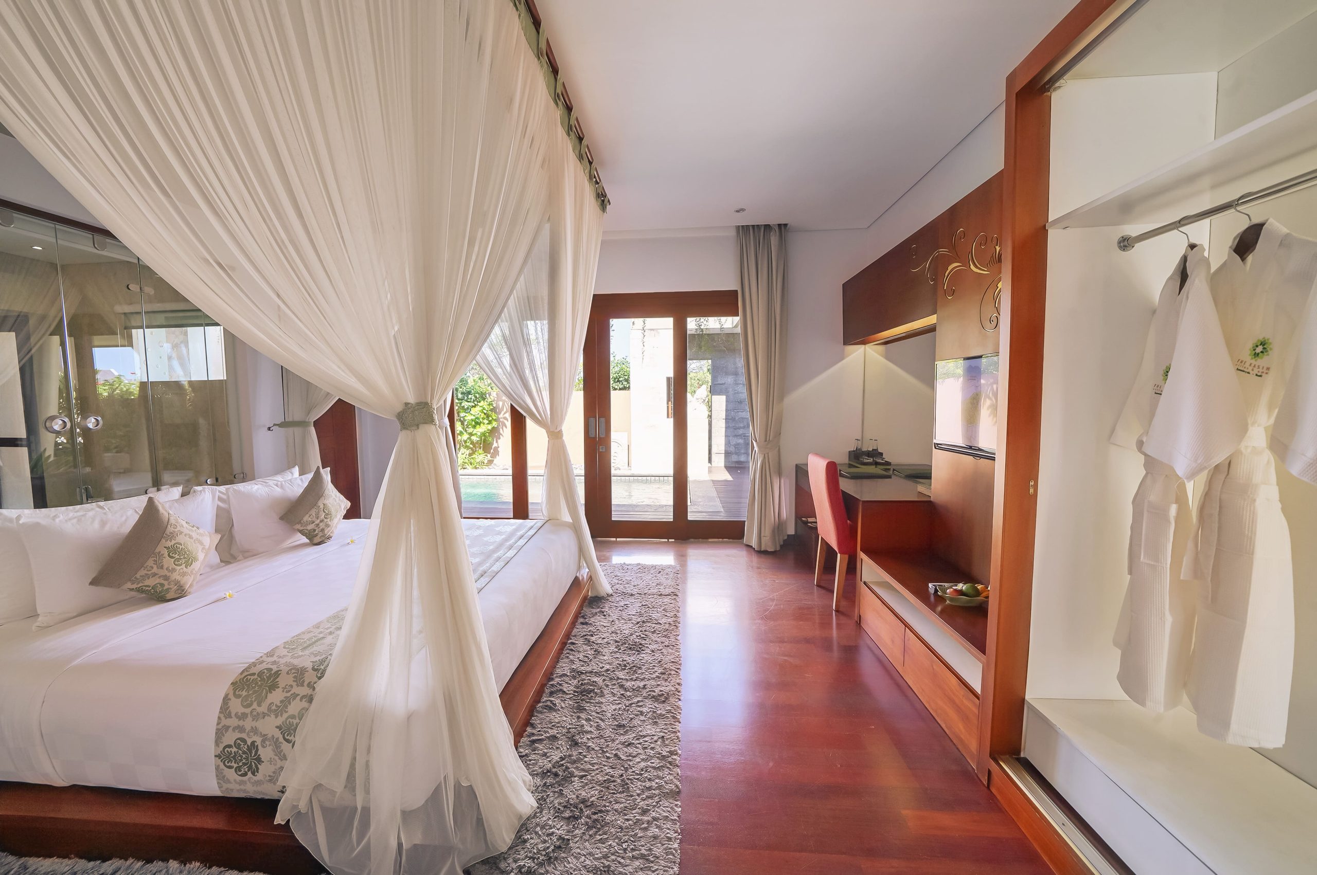 Comprising ten thoughtfully designed units, each villa features a private swimming pool and architecturally crafted living spaces. Revel in modern amenities like free wifi and an LED flat-screen TV. Tailored for Bali honeymoons, these villas offer an ideal setting for romance. Treat yourselves to a private candlelight dinner and a romantic bedroom and bathroom setup, enhancing your holiday experience.