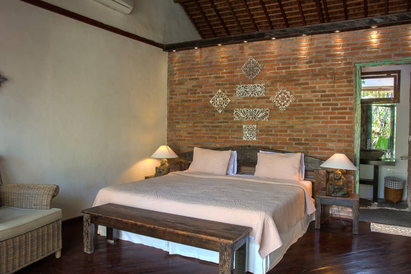 Each room is equipped with a desk, spacious dressing area and has traditional Indonesian décor adorning the space. Large wooden doors lead the way to the en-suite bathrooms with one featuring a stone-carved bathtub in an open setting, and the other one being indoors, featuring a shower area. The well-appointed furniture, the smooth light and tastefully selected décor make up two gorgeous rooms that offer a peaceful space to retreat and have a good night sleep.