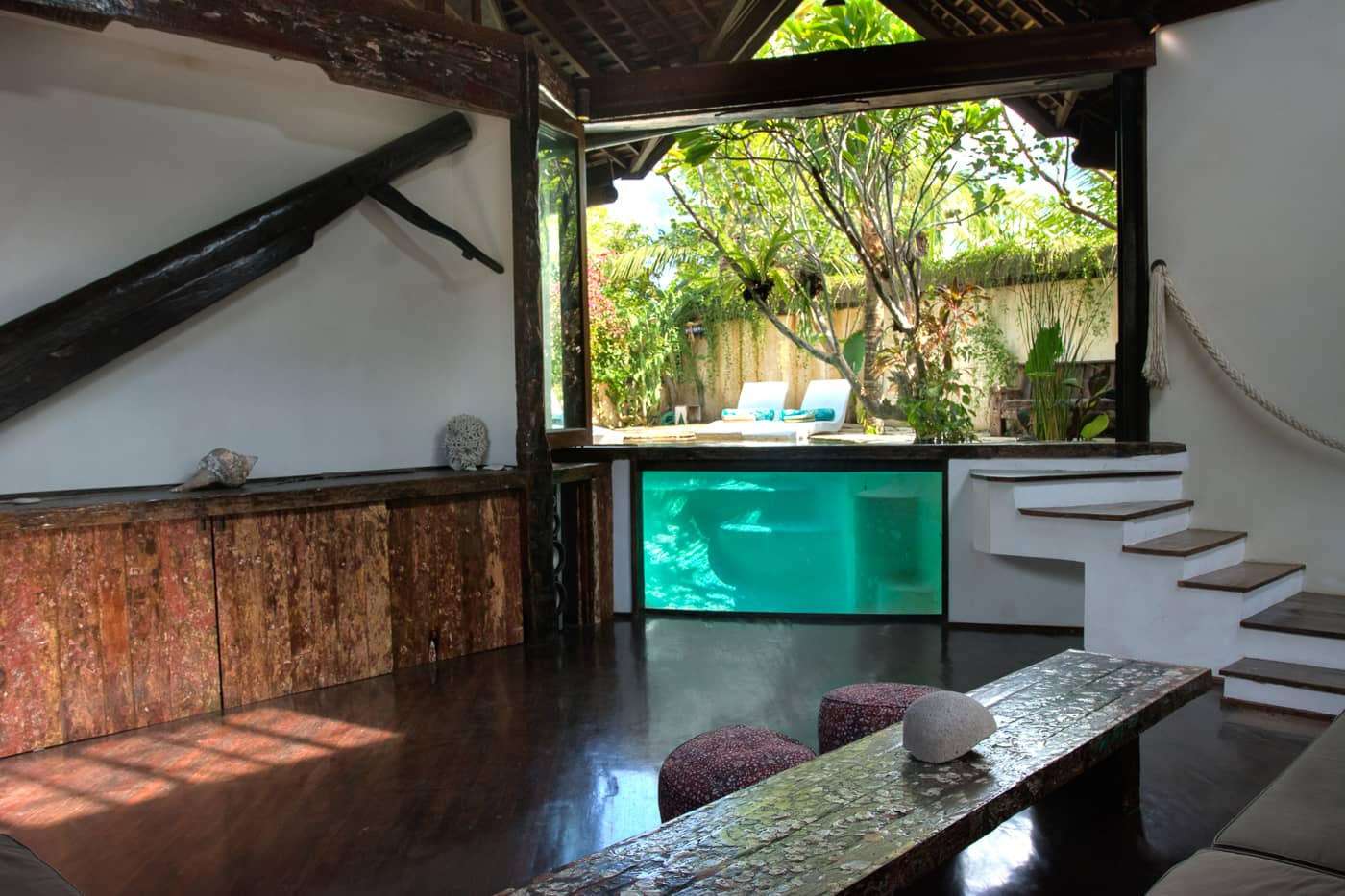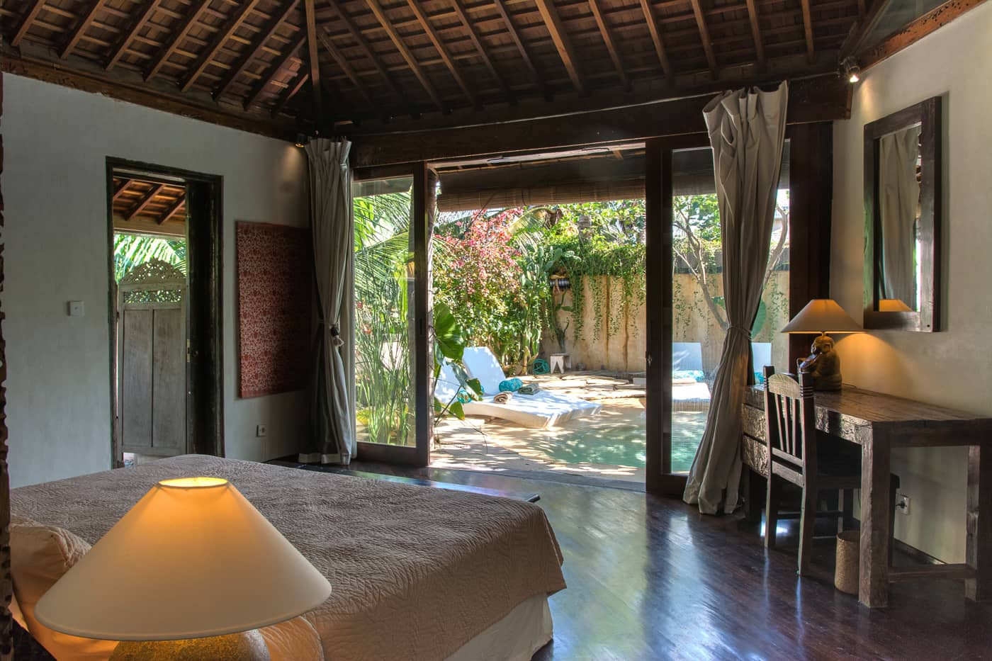 Two air-conditioned bedrooms that sleep up to four guests are set on the opposite ends of the living pavilion. Large sliding doors open up to the guest rooms offering direct access to the swimming pool and keep it bright and light-flooded. Inside the rooms, you will find elegant dark wooden flooring with matching furniture, sheltered by a pavilion roof. The king-sized beds have a beautiful white canopy dangling from the ceiling, protecting you from mosquitos and turquoise bed sheets that seem to reflect the color of the swimming pool.