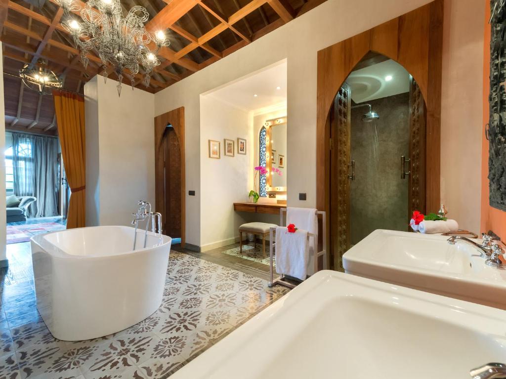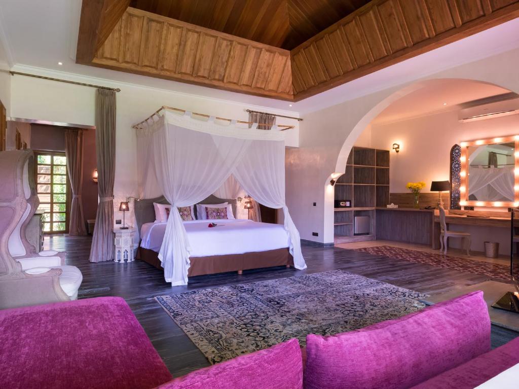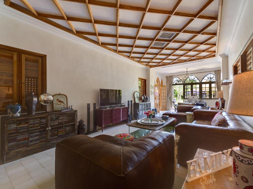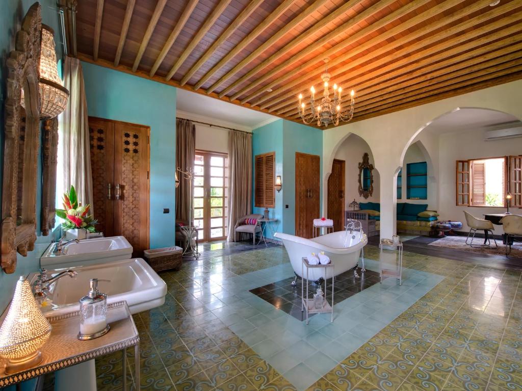 Villa Sayang d’Amour offers you a total of 6 Bedrooms. All of these rooms are well-accommodated and are filled with all kinds of luxurious furnishings. The first bedroom is the master suite. It offers lovely window panels and classic drapes and decorum. This room ensuites a King-sized bed and the free-standing tub and alfresco shower in its bathroom add to the overall bathing experience. The other five rooms are guest rooms. The two rooms in the main pavilion offer a rooftop garden and ensuites a queen-sized bed. The dedicated bathroom in these rooms offer free-standing bathtubs. The rest three rooms offer lovely mirror panels and beautiful beddings. They ensuites King beds and have their own dedicated bathrooms. These bathrooms offer a great bathing and showering experience with sunken bathtubs and raindrop showers. These glamour Moroccan themed rooms are furnished with some really fluffy and comfortable pillows and sofas. Also, their spacious designs will make your bedtime sound and amazing.