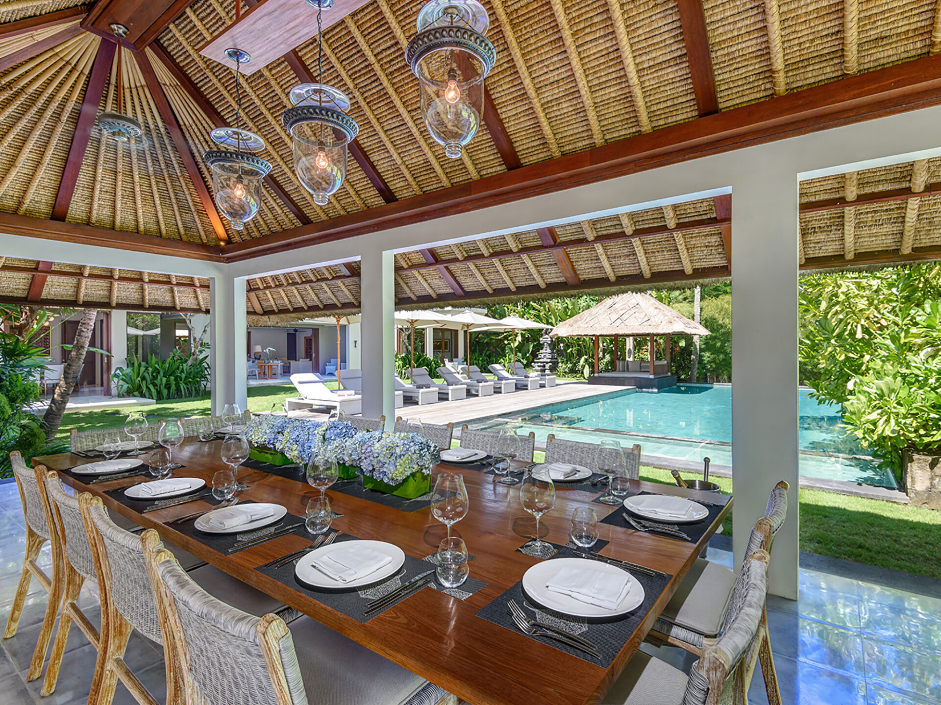 The pool is accented by two large fire pits, which can be lit up by the staff to create a divine scene with the ocean as the backdrop. An outdoor lounge is well-catered to suit your needs, complete with comfortable sitting, where you can enjoy your meals while you relish in the relaxing atmosphere of Canggu. Another separate traditional Balinese pavilion with thatched-roof houses an alfresco dining area.