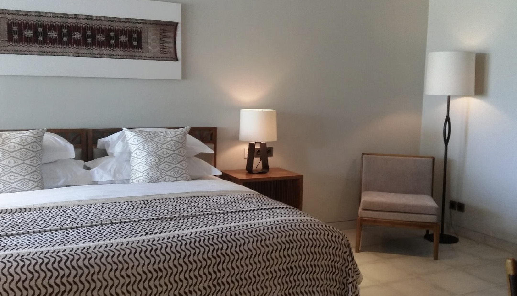 The open-plan living area at Seseh Beach Villa 2 is contemporary and luxurious with a neutral palette featuring greys, frosty tones to keep the décor to a minimalistic level. The space is well-furnished with the utmost comfort in mind. There are comfy sofas and armchairs placed facing a flat-screen TV. The TV is set in a traditional-looking wooden console. Just behind the sitting area is another sitting space with comfortable furnishings.