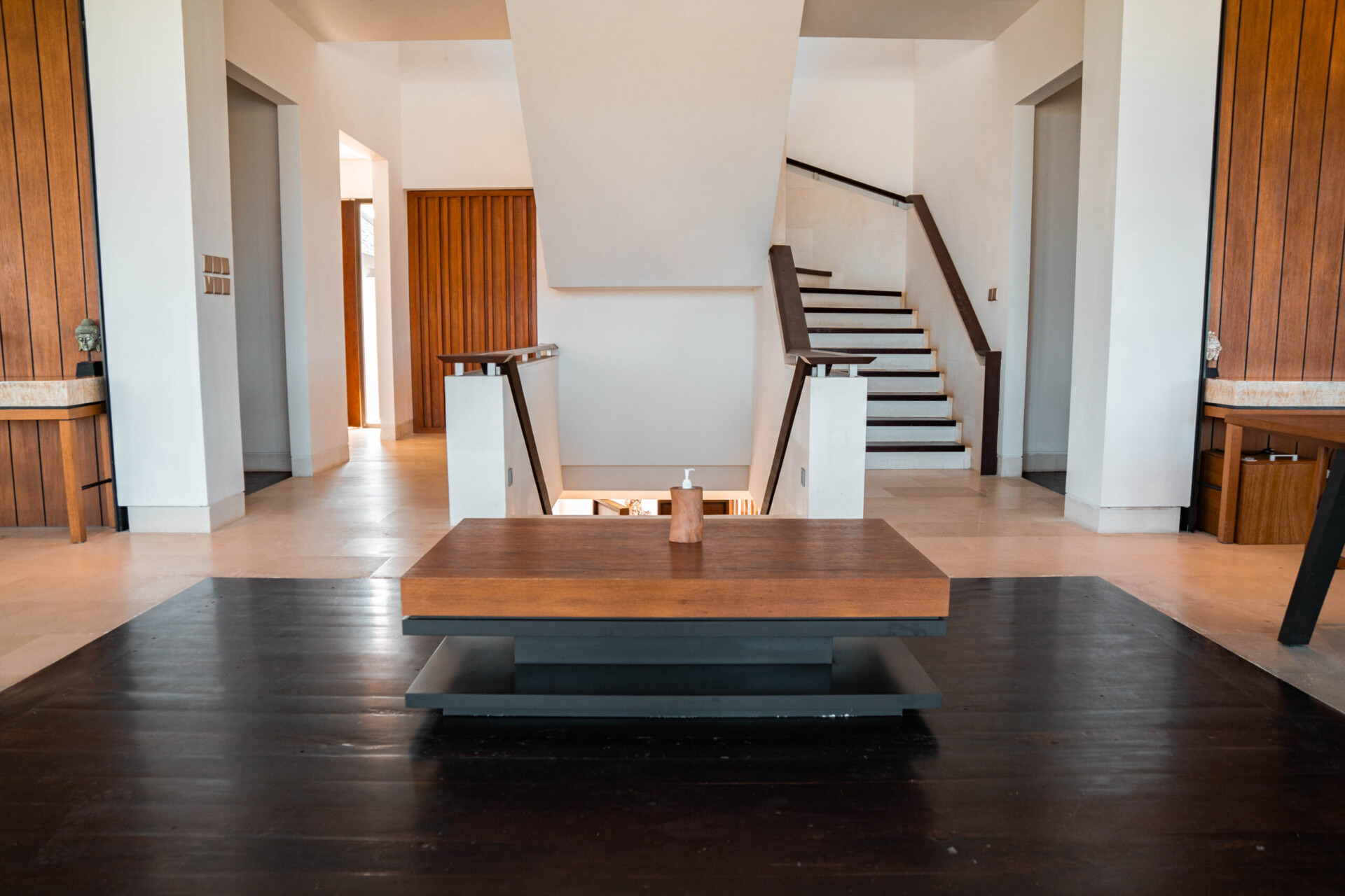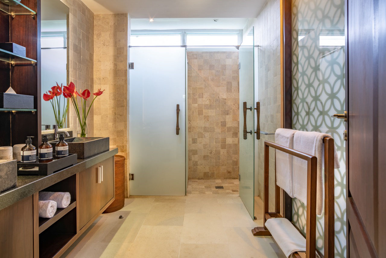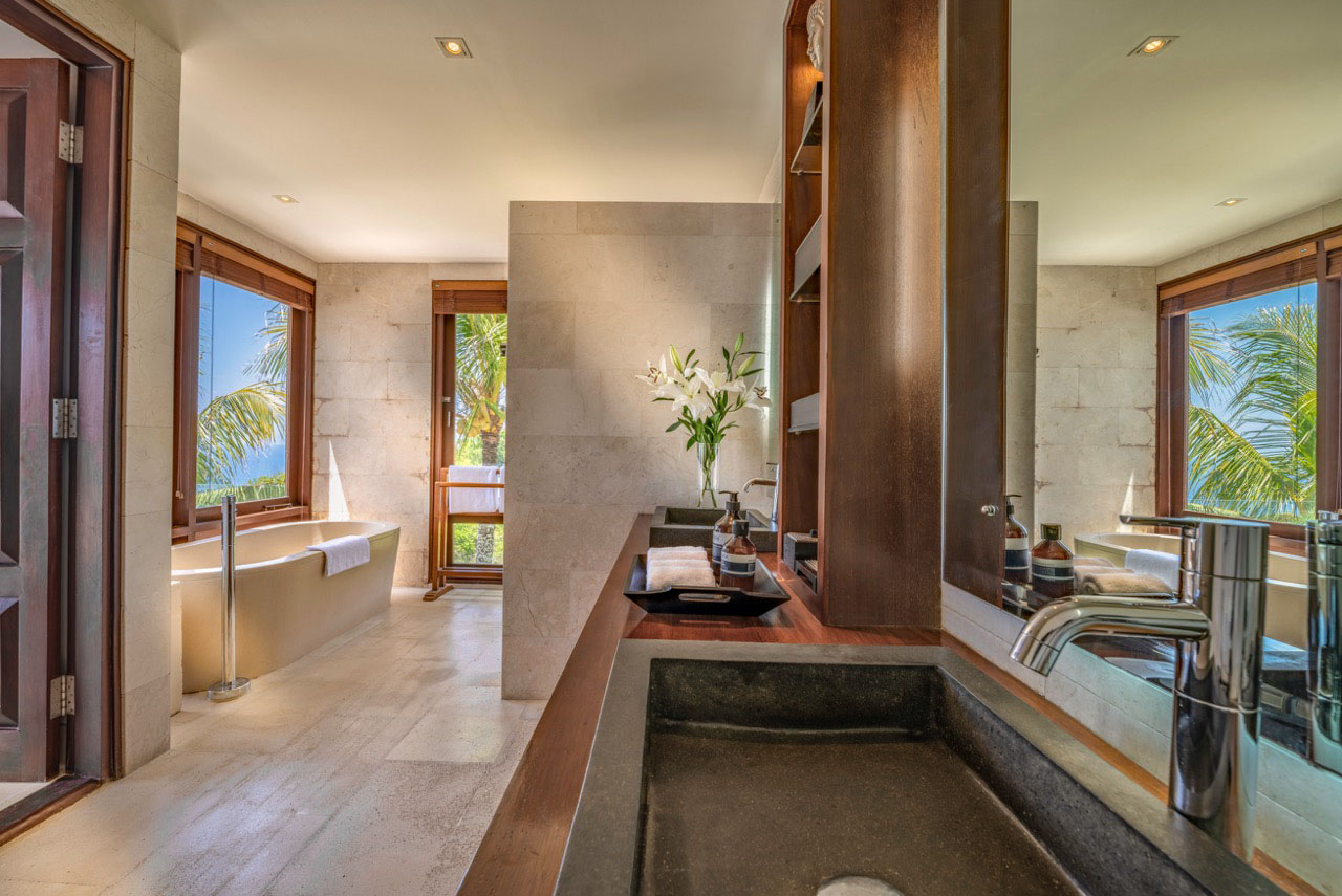 There are two master bedrooms in the villa, both on the upper level of the property with sprawling views of the ocean below. Each master bedroom has a king-sized four poster bed-frame draped in beautiful silk walls and curtains. There is a sunken stone bath for one of the master bedrooms, while the other one has a freestanding bathtub.