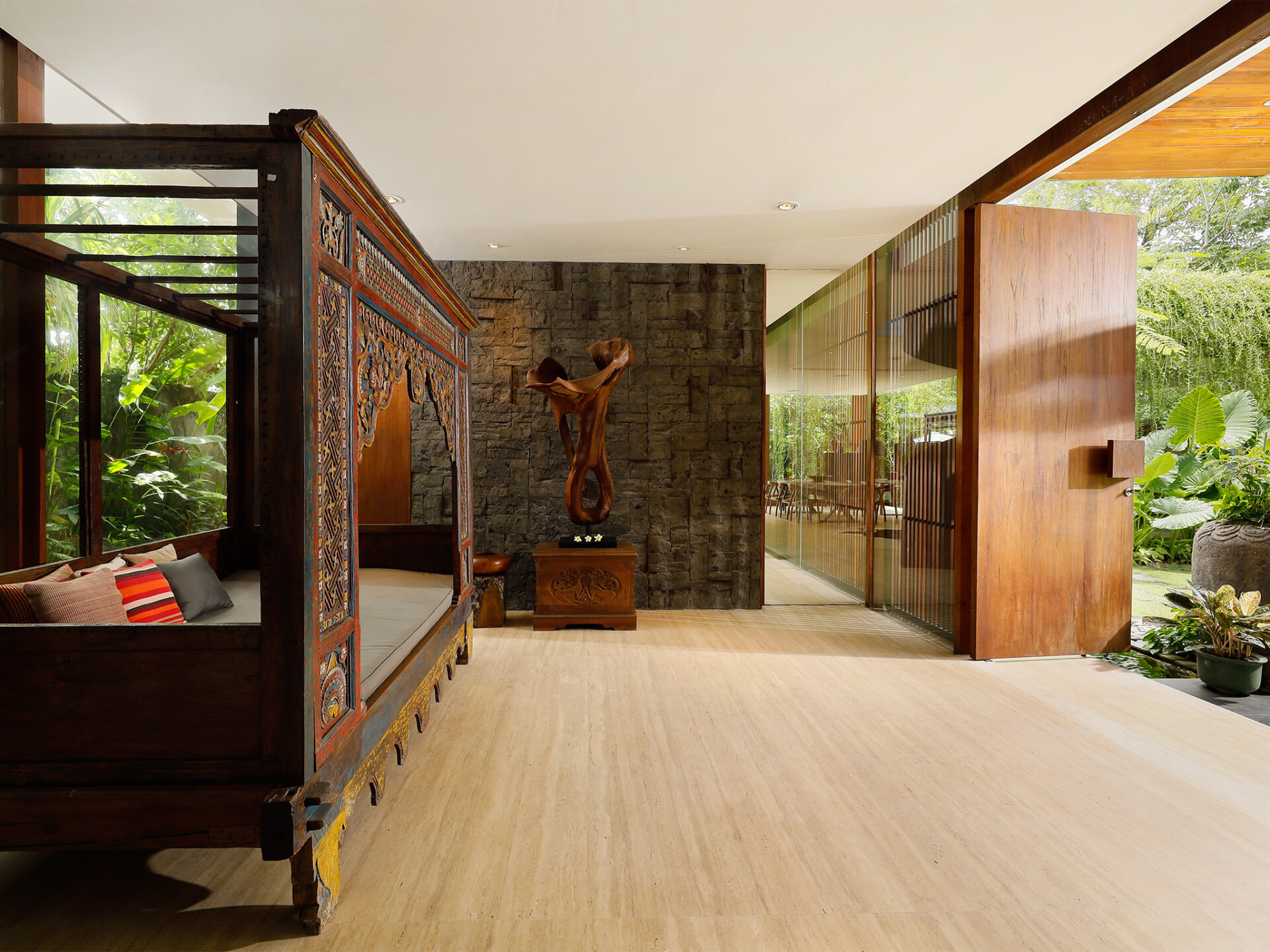 Svarga means “heaven” to the Hindus. Villa Svarga will certainly be heaven for those seeking peace, tranquility, and solitude. You will feel this from the moment you step into the estate. This 5-bedroom holiday villa in Sanur will also be a great choice for those looking for a luxury vacation in a premium location. A world of opulence awaits you. Every need and comfort of the guests is going to be looked after here. The house has a personal guest assistant, a team of housekeepers, a gardener, and security personnel. The villa manager will oversee the work and ensure that you have the best of everything. Simply can sit back, relax, and enjoy your holiday.