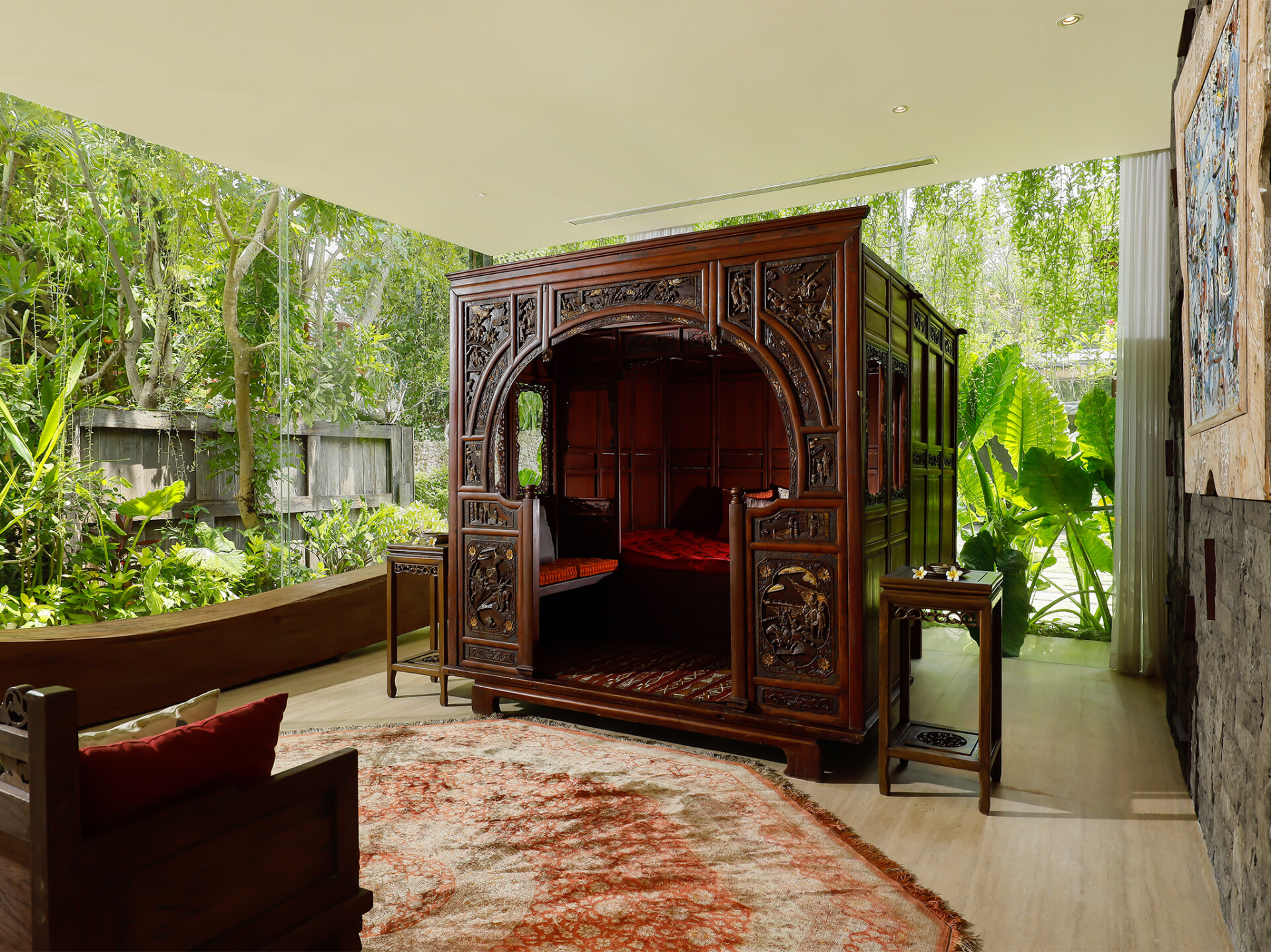 The villa is surrounded by lush greenery. The tall trees all around provide natural shade. Inside, you have a private swimming pool, a barbecue, air-conditioned rooms, a kitchen, and plenty of lounging and dining areas. Villa Svarga is secluded enough to provide a tranquil and private stay but is still close enough to the many amenities and activities of Sanur. It has the perfect location in Bali. It will surely exceed your expectations.