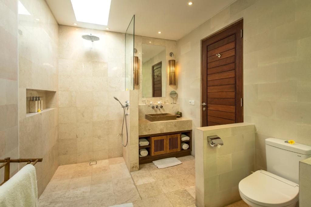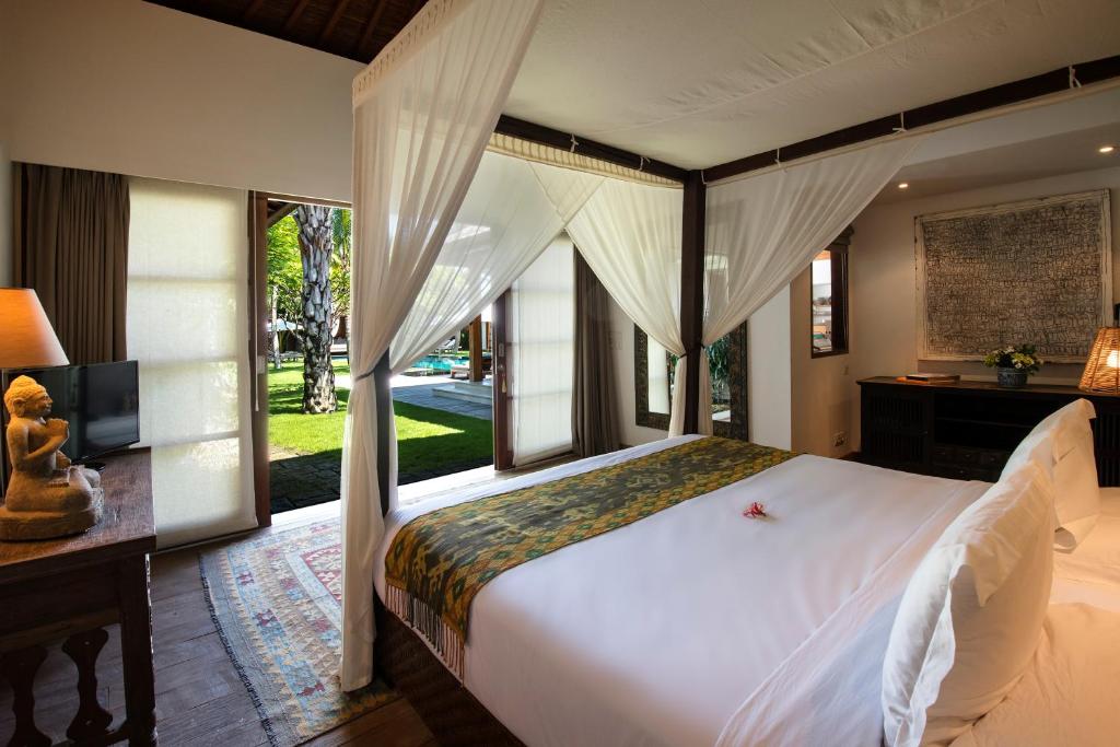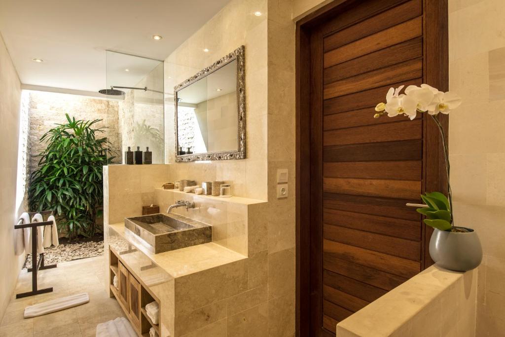 The villa houses a total of seven gorgeous bedrooms, sleeping up to 14 guests. The master suite is located at the head of the pool and offers direct access to the pool deck. The interior of the master suite is decorated with lots of love to detail, displaying antique furniture, distinctive traditional Indonesian artifacts, and artworks that give the room an elegant, yet stylish look. For your comfort, the suite is fitted with a king-size bed, a flat-screen TV, air-conditioner, and desk. A high ceiling pavilion roof and large glass sliding doors keep the room sunlit. Beautifully wood-carved leaf doors lead from the bedroom to the extensive walk-in dressing room that connects to the private en-suite bathroom. The modern bathroom is partially shielded by a glass pavilion, creating an outdoor experience, featuring two washbasins, a natural stone bathtub, and a shower area.