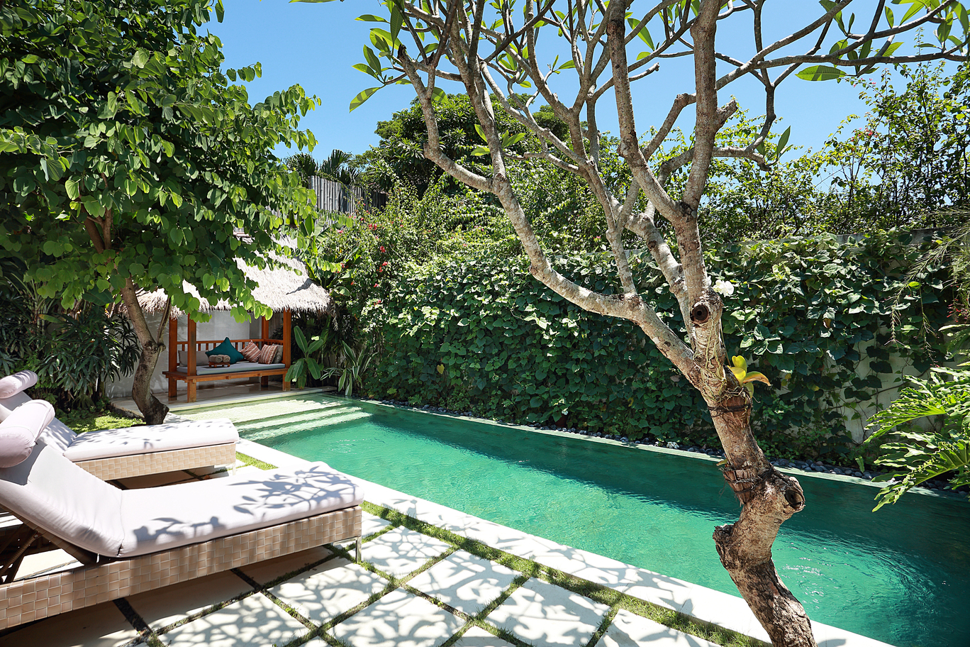 Built on more than 200-meter square, the villa is decorated with mixed Indonesian sculptures along with a comfortable and unique designed living area combined with couches and dining table, fully equipped kitchen, open-air bathroom with separate bathtub/shower and fish pond. Mini daybed set by the pool along with two sun loungers. No twin beds available.