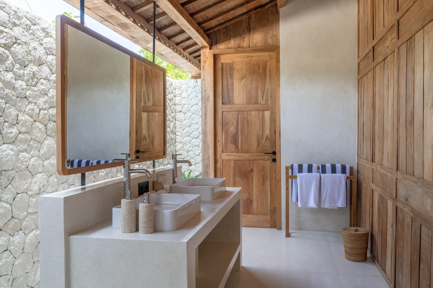 Almerya Estate features two private pools—one for each villa. The Almerya villa boasts an 18-meter swimming pool, while Palmerya offers a 7-meter pool. Both are surrounded by lush greenery and inviting sunbeds, creating an ideal setting for lazy afternoons under the tropical sun. The estate also includes a dedicated yoga space and offers internet connectivity for your remote work.