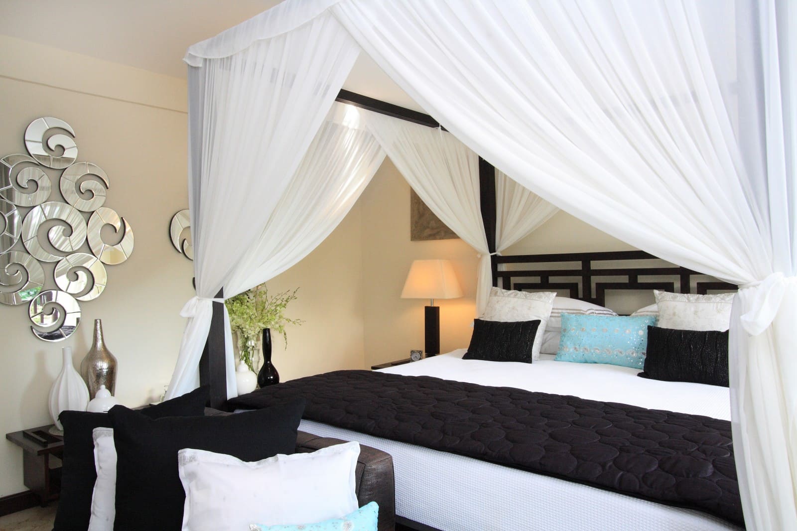 Upstairs you will discover an open-air living and dining pavilion which is fan-cooled, with large sofa’s, an additional dining area which seats 8 people, and two large day loungers which are on the balcony. Views to the Indian Ocean are spectacular, the sunsets are breathtaking.