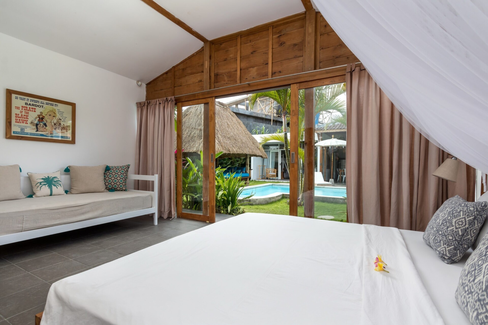 Villa Atmo is a Joglo style holiday property – a traditional vernacular house of the Javanese people. This 4 bedroom villa brings you close to the Indonesian culture and the bond the local people have with nature by using all naturally sourced materials in their architecture and interior design. This charming villa is mostly designed targeting traveling families or groups, with bedrooms that feature bunk beds which are ideal for children and solo travelers. The color theme of the villa interior is a pure white that symbolizes peace and also luxury. Located at the heart of Seminyak with all the modern comforts and a unique design, Villa Atmo is very much reasonably priced when compared to other similar properties in the area.