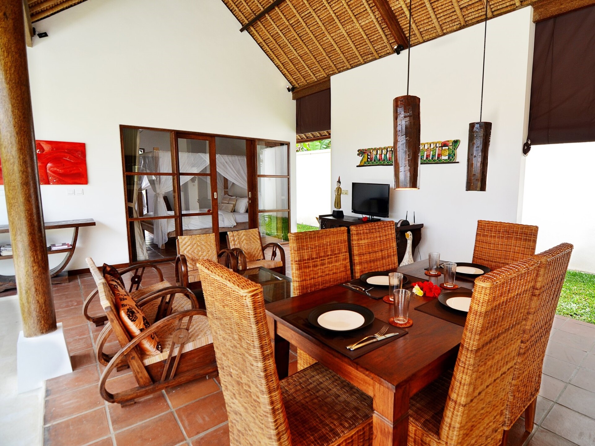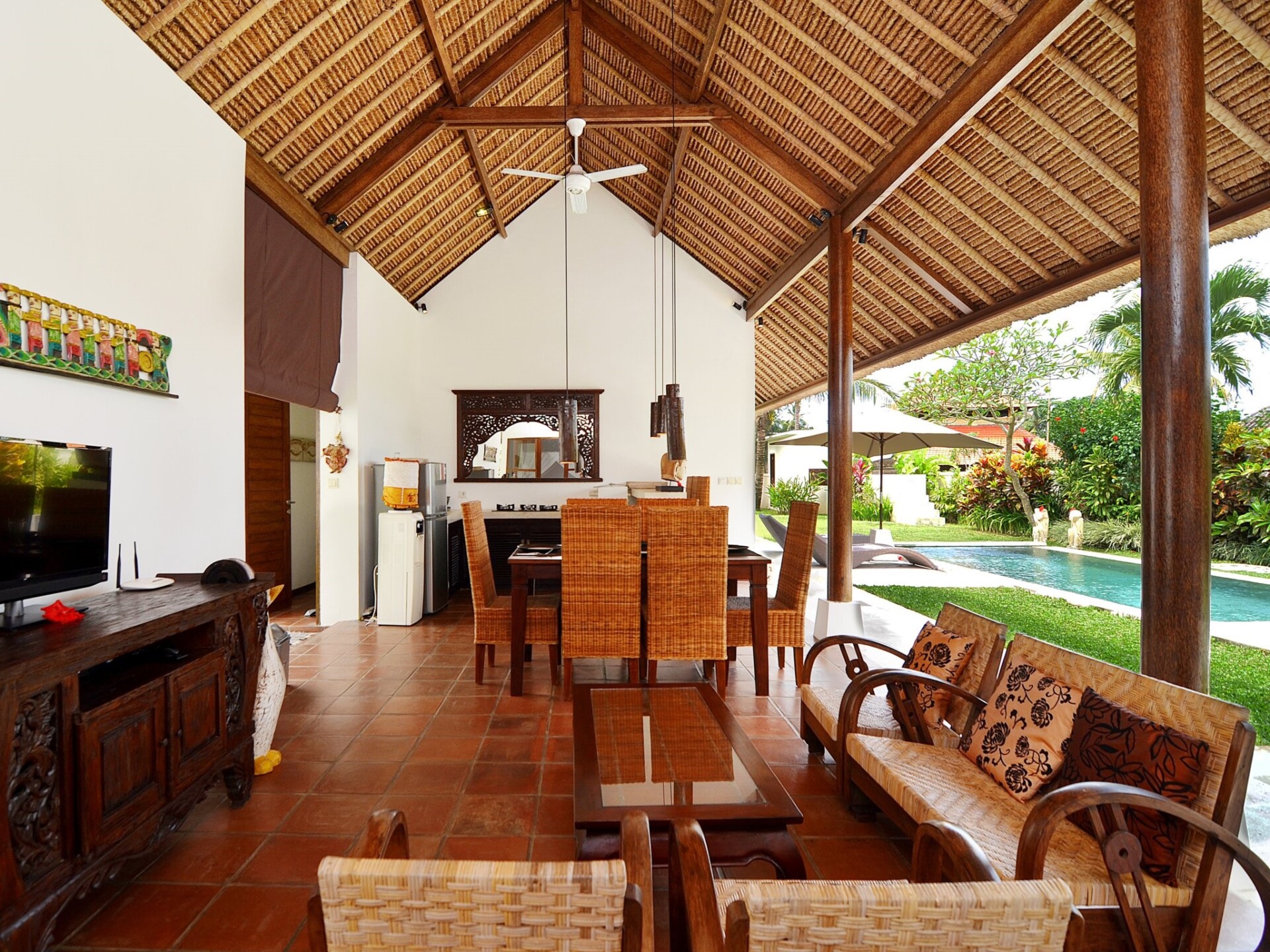 Located in the beautiful village of Pejeng amidst rolling paddy fields and tropical palms, just a short drive away from Ubud’s city center, Villa Candi Kecil Tiga is the perfect getaway for a vacation in Bali’s cultural capital. The three bedroom villa offers the perfect combination of modern living and traditional Balinese aesthetics. Ancient hindu temples and natural attractions are located in close proximity to the villa and with its friendly staff and serene surroundings, it is the ideal spot to escape into a tropical island vacation. A daily Indonesian breakfast is included during your stay. If you would like an additional breakfast, the villa staff can assist for an extra fee.